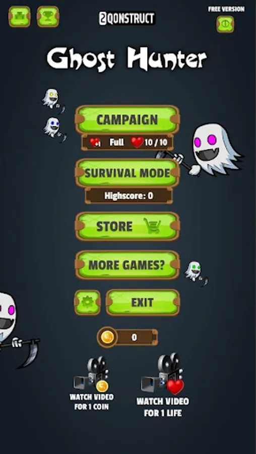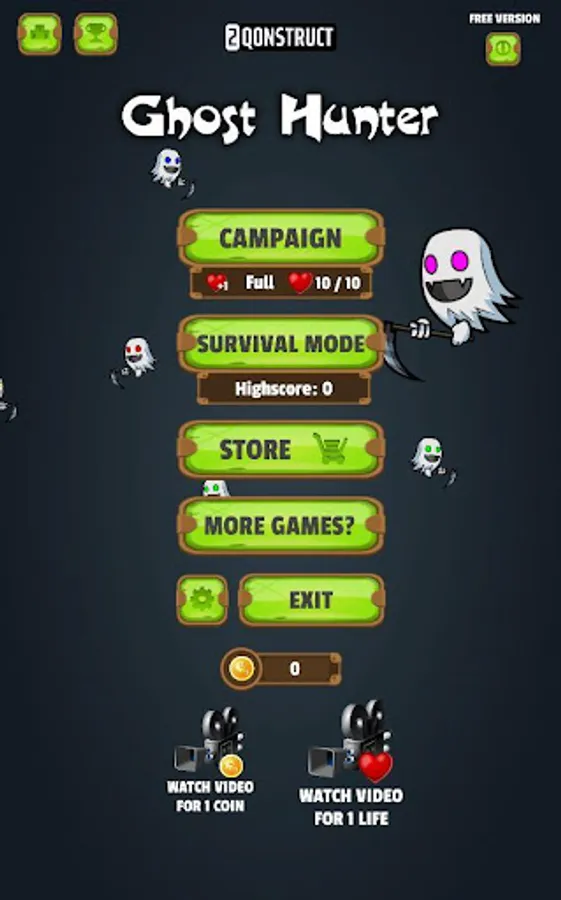Looking for a total different challenge? Try out the endless mode, this mode is for the ghosthunter that’s looking for a whole different challenge! Collect coins and upgrade your character to make it a little easier and make sure to pick up any special powers the ghosts drop. Try to beat your own and the worldwide highscore! How many ghosts can you take?