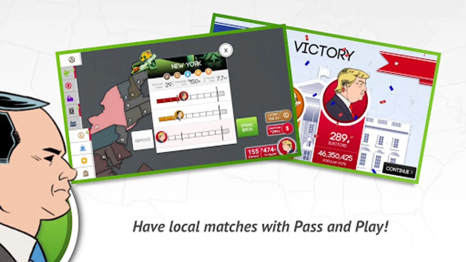 So battle it out on the road to the White House by running against political opponents in key states, winning over interest groups and accumulating Electoral Votes to become President!