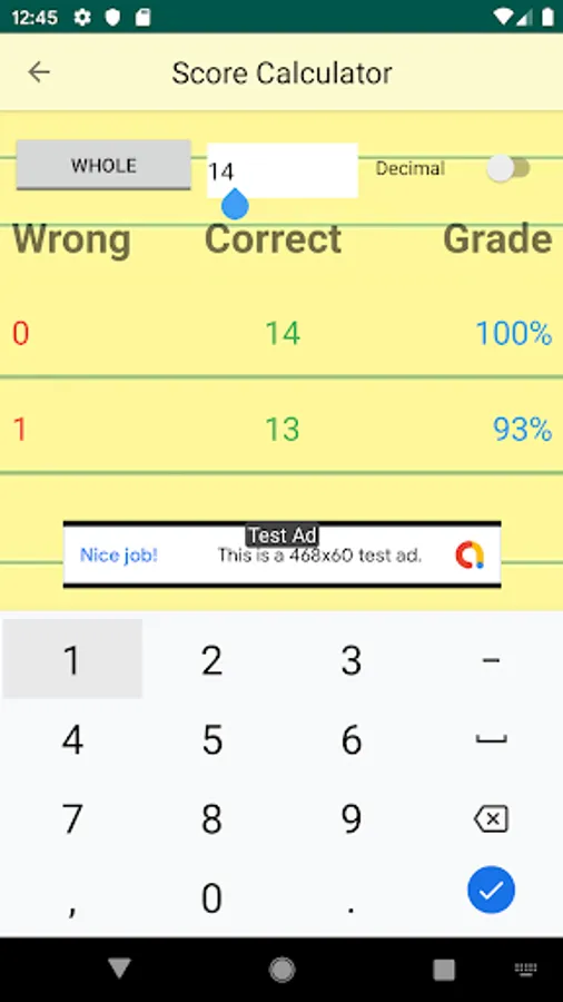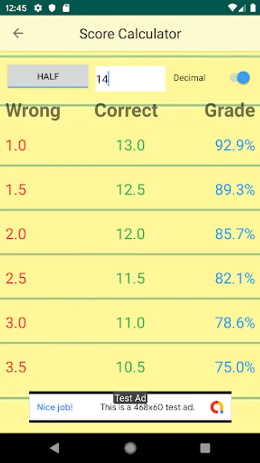 When using the score calculator, pop in the number of points you want to calculate and you’ll be given a grade according to the number wrong. Toggling between decimal point percentages or rounding to whole number percentages can be done with a single tap! Want to include half points while calculating percentages? Another single tap and Elegant Grader will provide the data you need! You can calculate from 1 to 999 points.