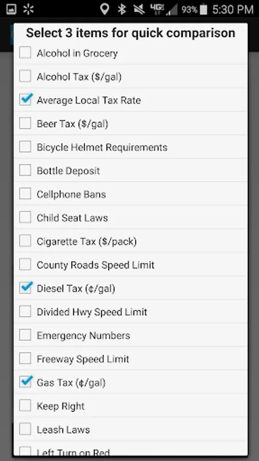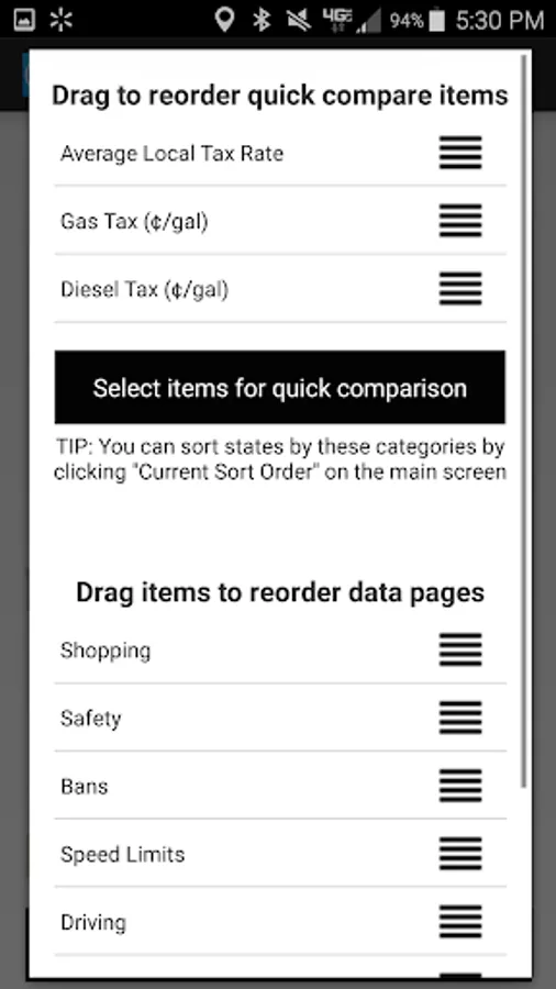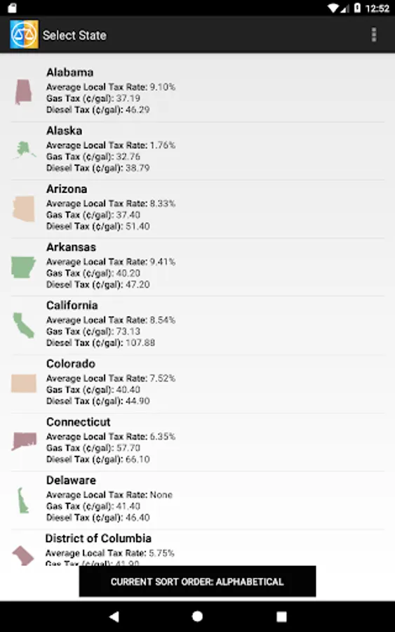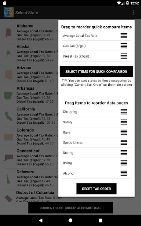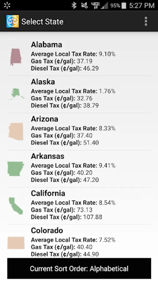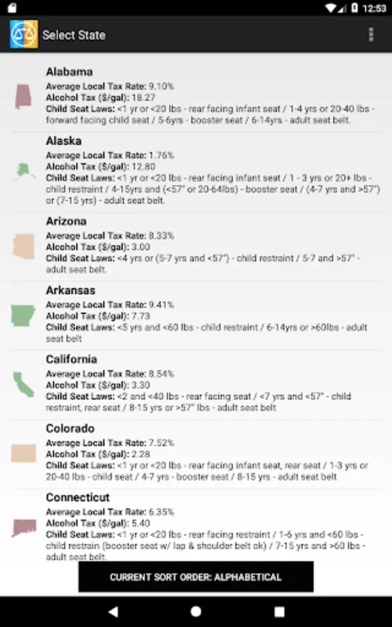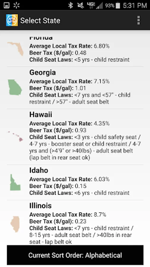 + Custom Sorting: You can sort the state list alphabetically, by distance from you, and by your selected Quick Compare fields. If you’ve ever wanted to see what state has the lowest alcohol or fuel taxes, this feature makes it easy!