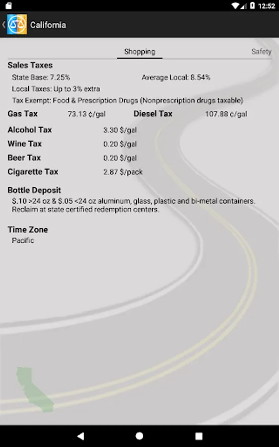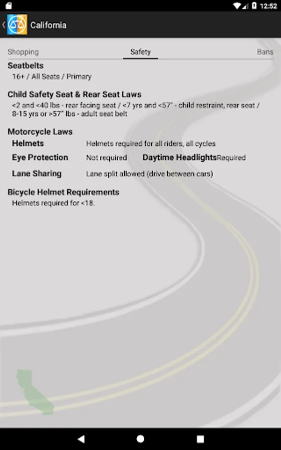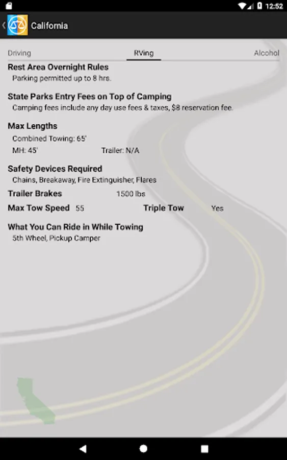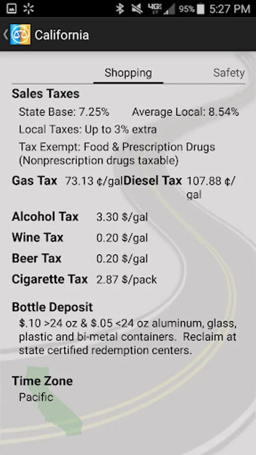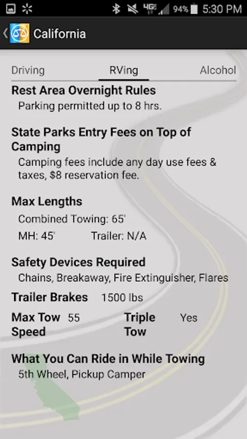 Currently State Lines tracks over 55 pieces of travel relevant information for each of the 50 states; including cell phone & texting bans, seat belt & child safety seats, state sales tax exemptions, gas/diesel taxes, bottle deposits, time zones, towing & RV specific laws, rest area overnight parking limits, state park camping entrance fees, default speed limits, radar detectors, highway emergency #s, alcohol sales laws & taxes, smoking bans, open container laws, pet leash laws, bicycle helmet laws, motorcycle laws (helmet, lights, eye protection & lane sharing), left turns on red, u-turns, keep right and more.
