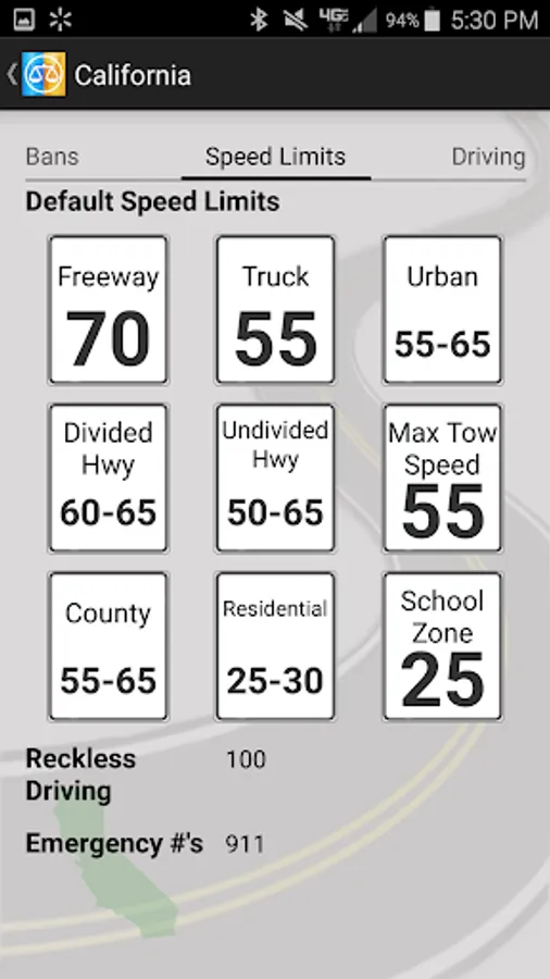 State Lines is intended to provide an at-a-glance summarized guide to rules and regulations, and it is not an exhaustive legal reference. While every effort has been made to provide quality up to date data, no warranty for accuracy of data is expressed or implied. State Lines assumes no responsibility for how you utilize the data. Keep in mind, local regulations can often override state level rules (so while a state may not have a cell phone ban, a city may - which will not be reflected in State Lines), and laws frequently change. Always verify with the proper authorities before assuming anything.