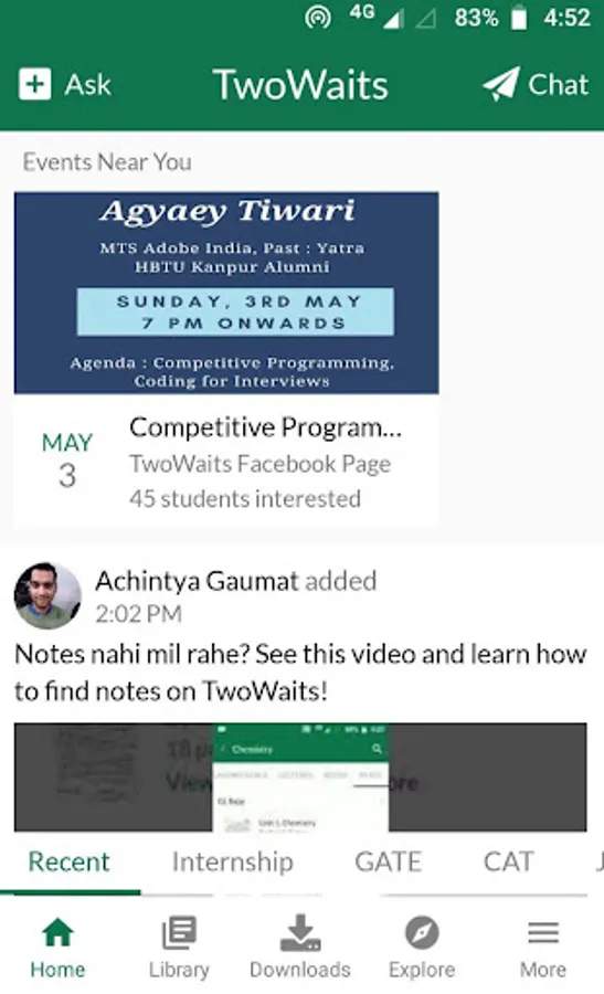 TwoWaits for android has a user-friendly, intuitive interface for notes, video lectures, syllabus, previous year papers, ebooks, GATE/CAT study material and internships offers. Find your college and connect with professors and peers digitally.