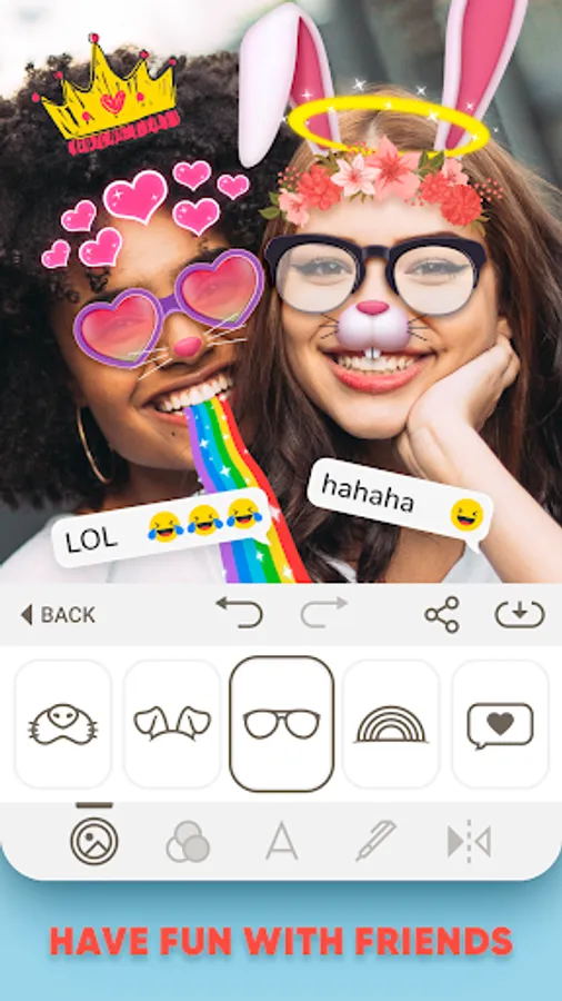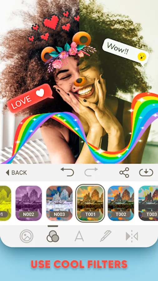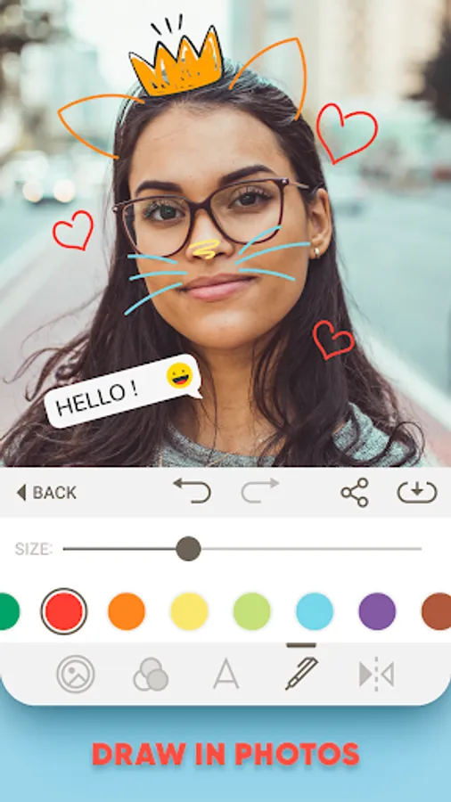 Cute editor filters allow you to easily make your photos more attractive. Write and draw on photos, just select a color and swipe your finger across the screen. Add any text and emoji to your photos.