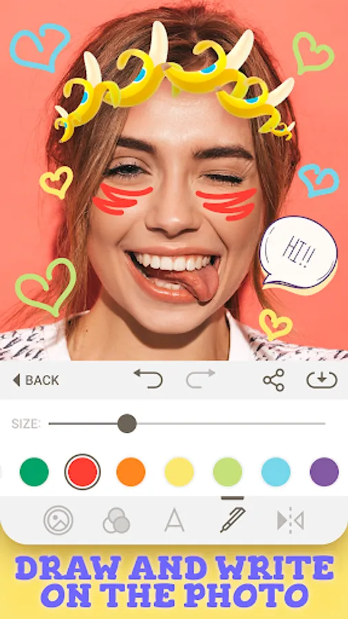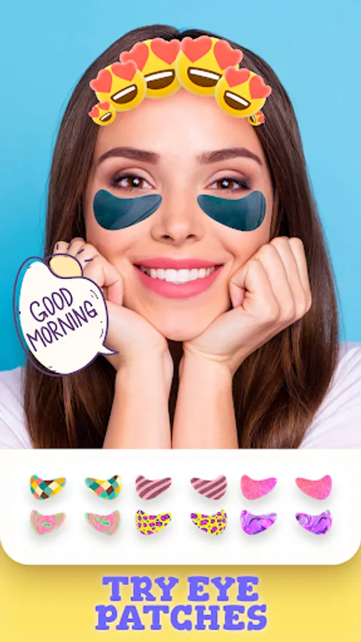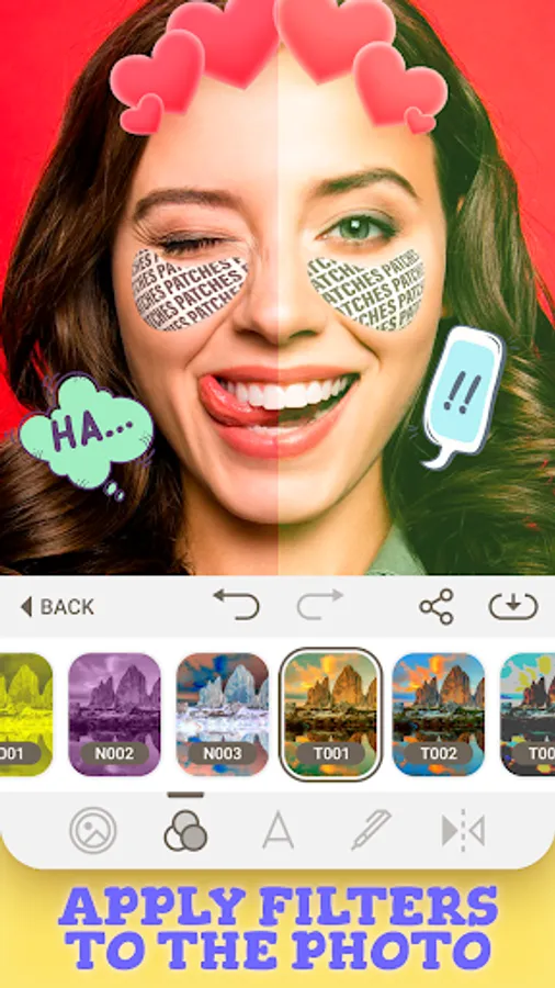 Try our photo editor, which allows you to put cool patches on your eyes. Just take a selfie and attach eye patches in the photo. Try on colored patches or patches with a pattern, put on a funny emoji crown and share cool photos with your friends. Colorful filters allow you to easily make your photos a ray. Write and draw on photos, just select a color and swipe your finger across the screen. Add any text and emoji to your photos.