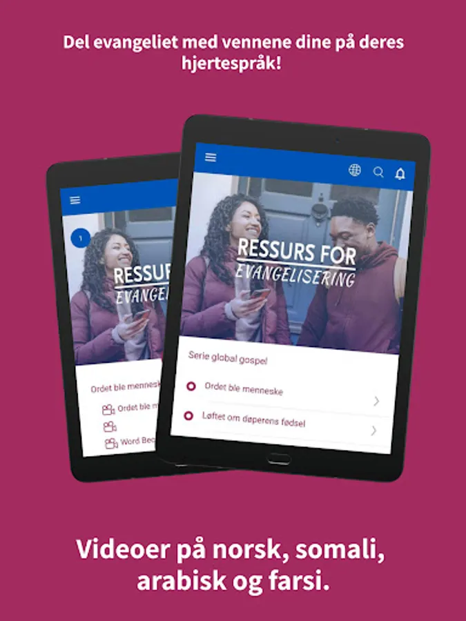 With this app, we want to build a bridge between new compatriots and Norwegian Christians, with a focus on communicating the Christian faith. The app is intended as a tool for Christians, where you can find teaching on various topics that are relevant in the face of immigrants: such as Islam, communication of faith, cross-cultural issues, and evangelistic resources that can be shared with Farsi, Arabic and Somali speakers.