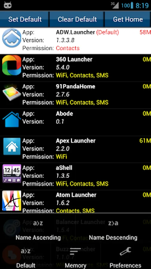 Get Home: This action will bring up a dialog to select Home Apps that are on the Android Market. By making a selection it will take you to the Home App selected on the Android Market. This way it makes it easy for you to try out some different Home Apps.