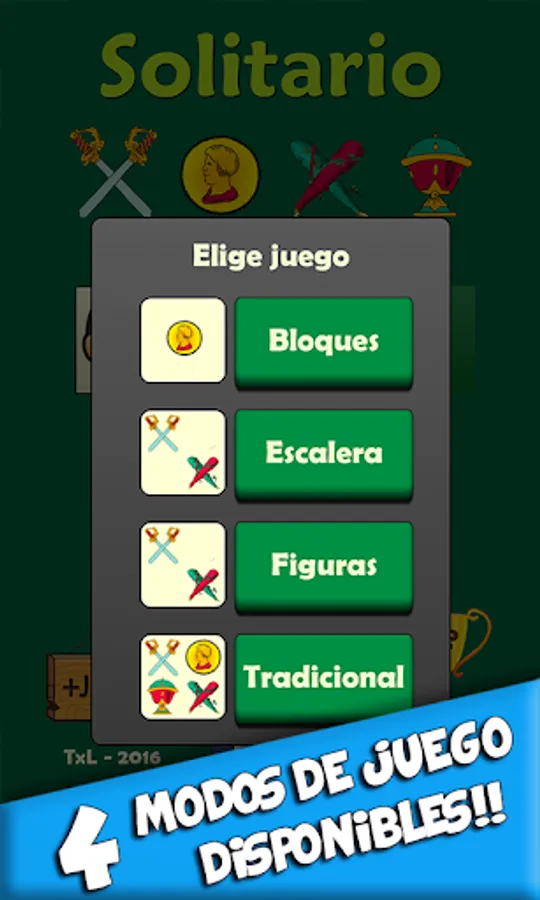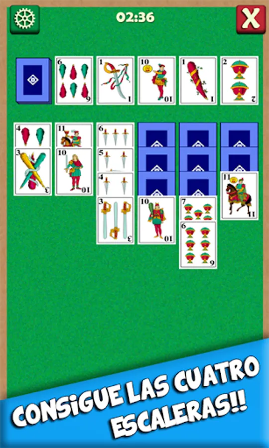 In solitaire mode B the objective is to achieve the four stairs starting with Ace. The deck of forty cards is distributed in ten piles of one to four covered cards, leaving one of the cards uncovered. Each card must be placed on its suit and corresponding order, each time a card is placed, another is discovered from the pile.
