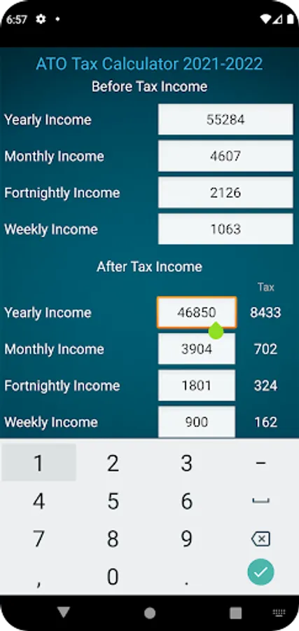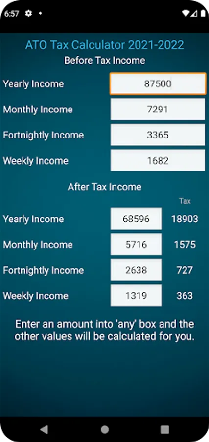 A simple tax calculator. If you have been offered a new job, been given a yearly rate and want to calculate what will end up in your pocket then this app is for you. Also, maybe you know what you get paid each fortnight but need to calculate your yearly gross income, then again, this app is for you. It doesn't take into account the 100 or so questions a tax advisor would ask, but gives a basic PAYG assumption based on the current Australian Tax Office tax tables. Type values into any field and it will calculate the others.