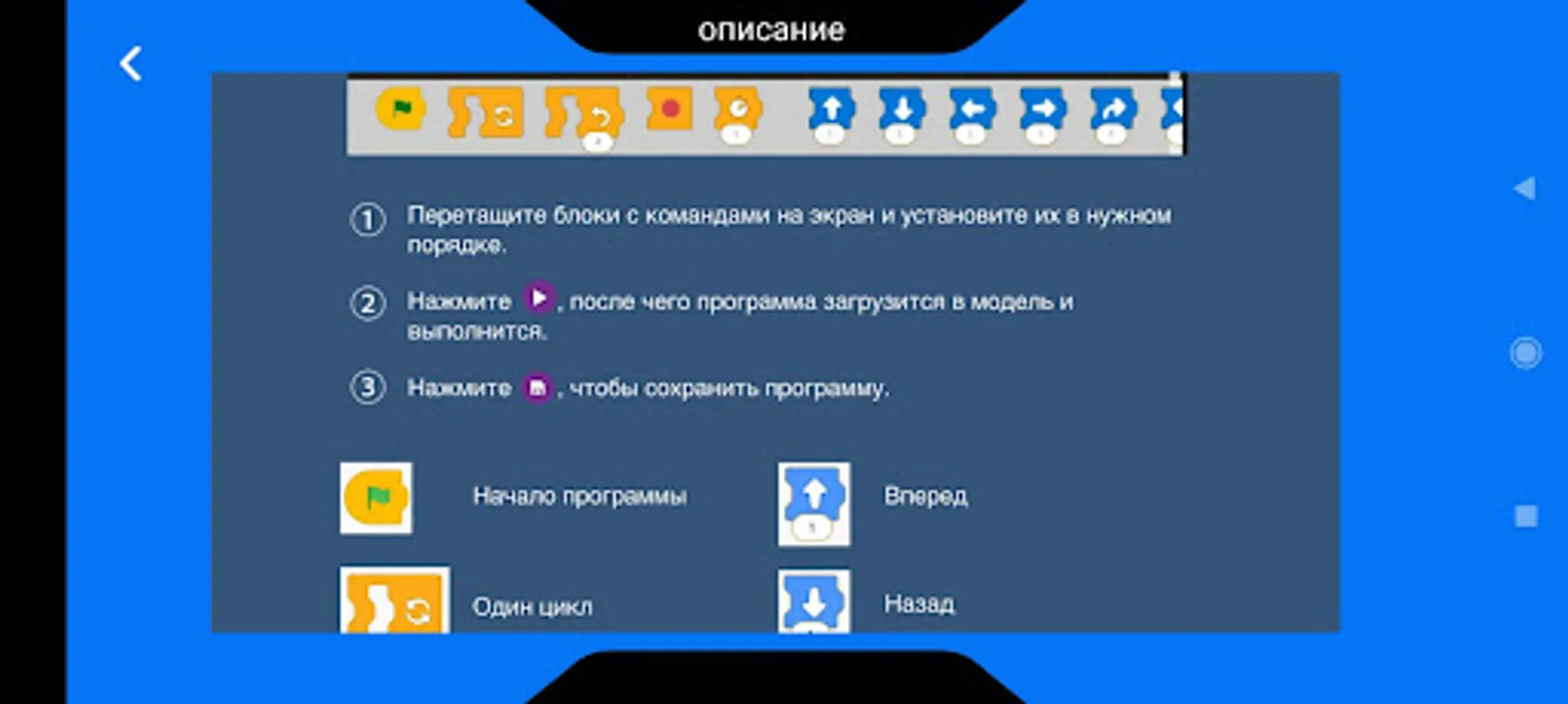 The application is designed to control and program the robot constructor from a smartphone. To connect, you need to turn on Bluetooth on your phone and follow the instructions in the app. Available control modes: using a gyroscope, building a route, programming mode and conventional control mode.
