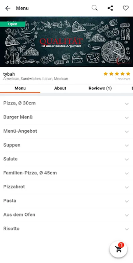 The pizzeria TYBAH offers Italian and oriental dishes with selected, fresh and high quality products, cleanly prepared and served with garnish. The relaxed and friendly atmosphere invites you to relax. Impeccable quality and convincing taste of the ingredients are the leitmotif when shopping. No matter whether fish, meat or vegetables: a seasonal selection is always preferred. This is the basis for creating culinary harmonious and delicate dishes. Our service is quick, humorous and friendly. TYBAH attaches great importance to professional, yet charming and unobtrusive service to guests and at the table. Our guests should feel completely comfortable. It is very important to us. Buon appetite! We look forward to your visit and your order