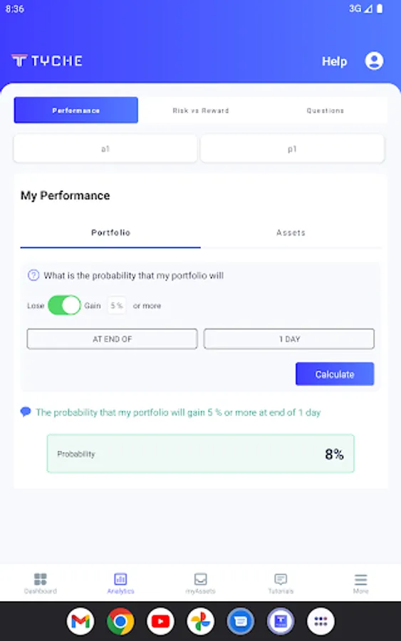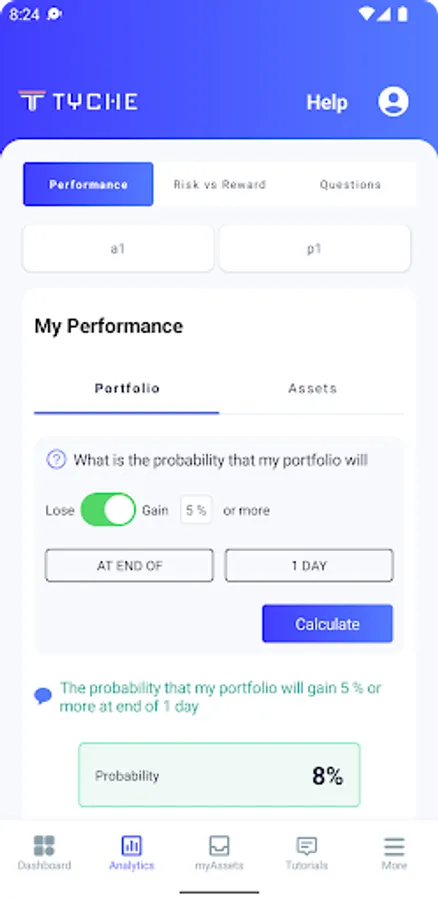 When contemplating adding an asset to your brokerage firm portfolio, Tyche will give you the expected risk of the new asset prior to buying it. Based on the expected risk you may be able to resize the intended investment.