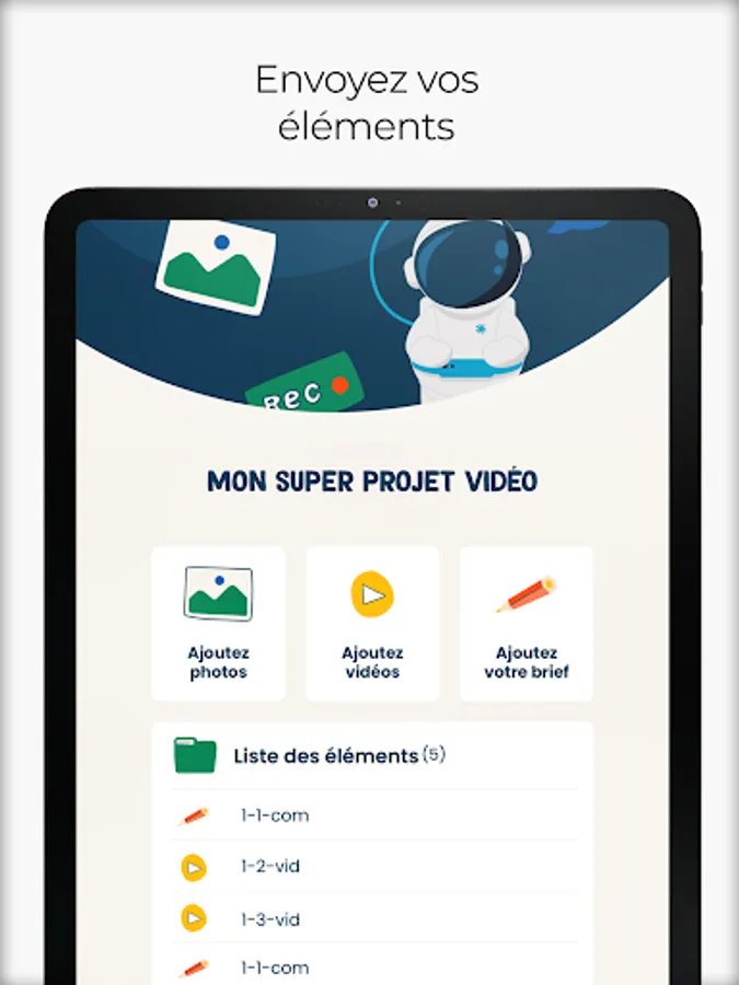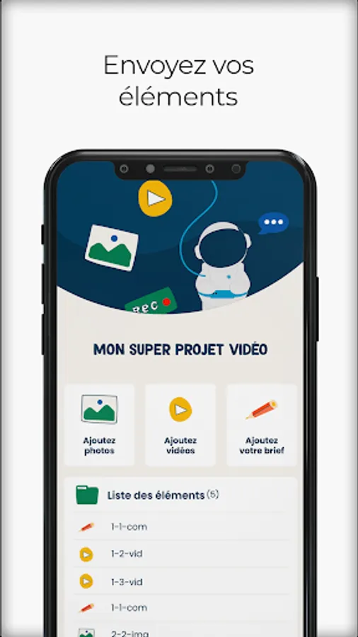 Create video projects alone or with collaborators. You send your project to our team of professional editors and directors. We create your video. You get a qualitative result in less than 48 hours.