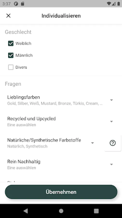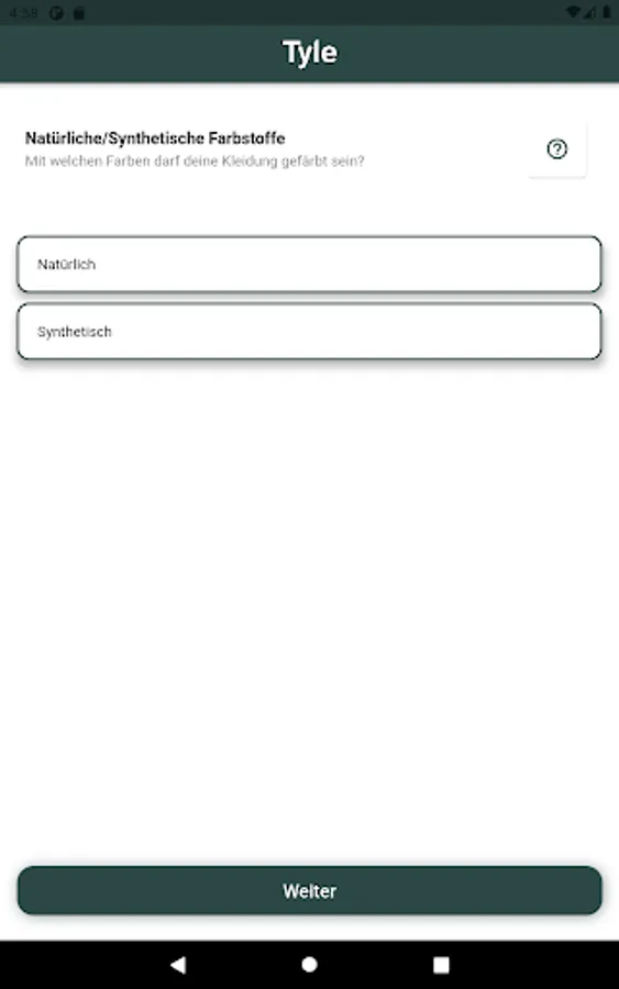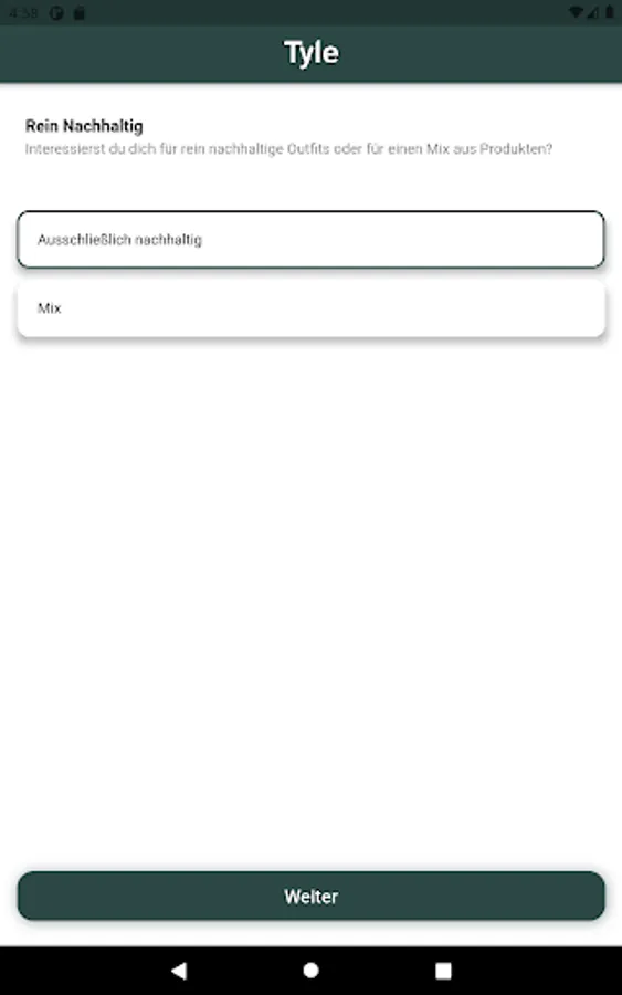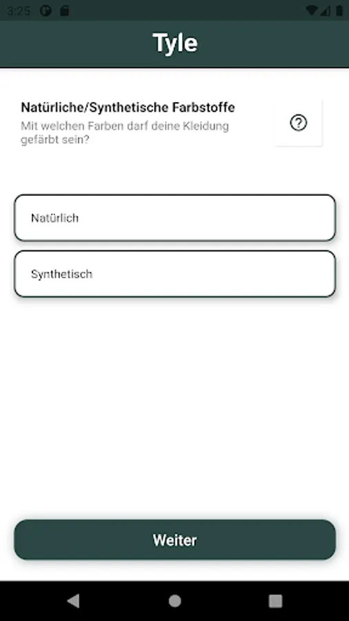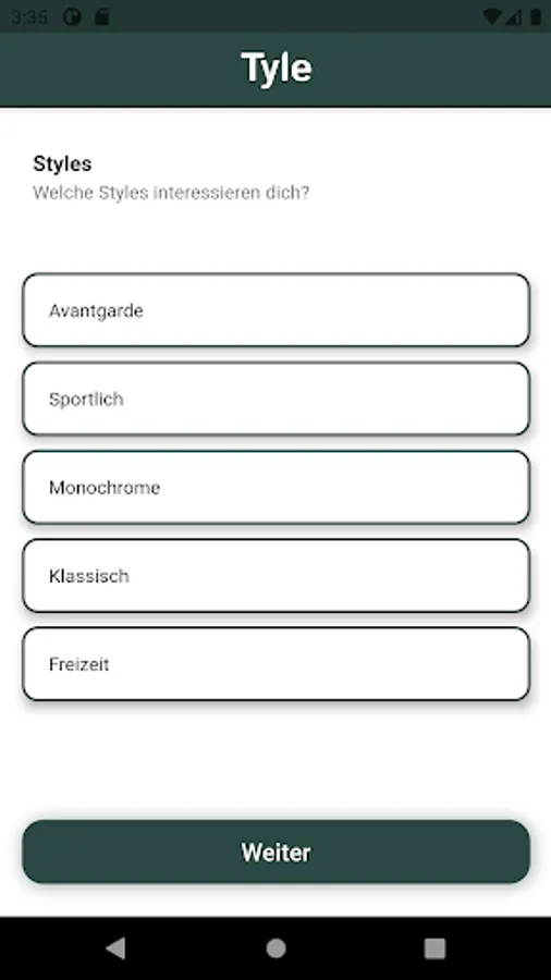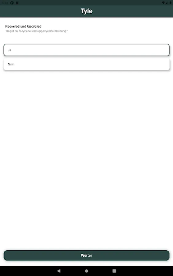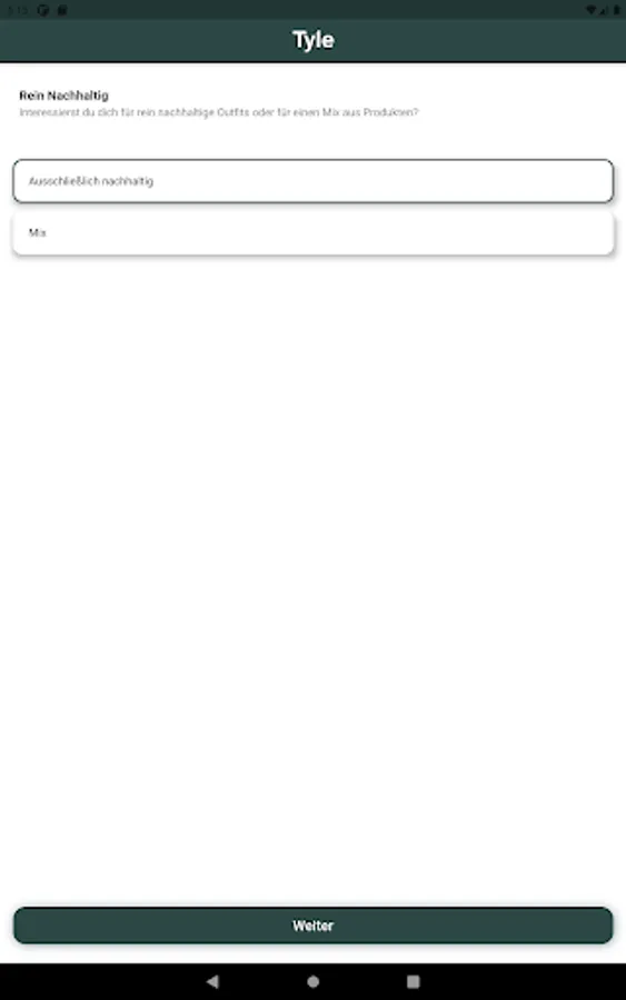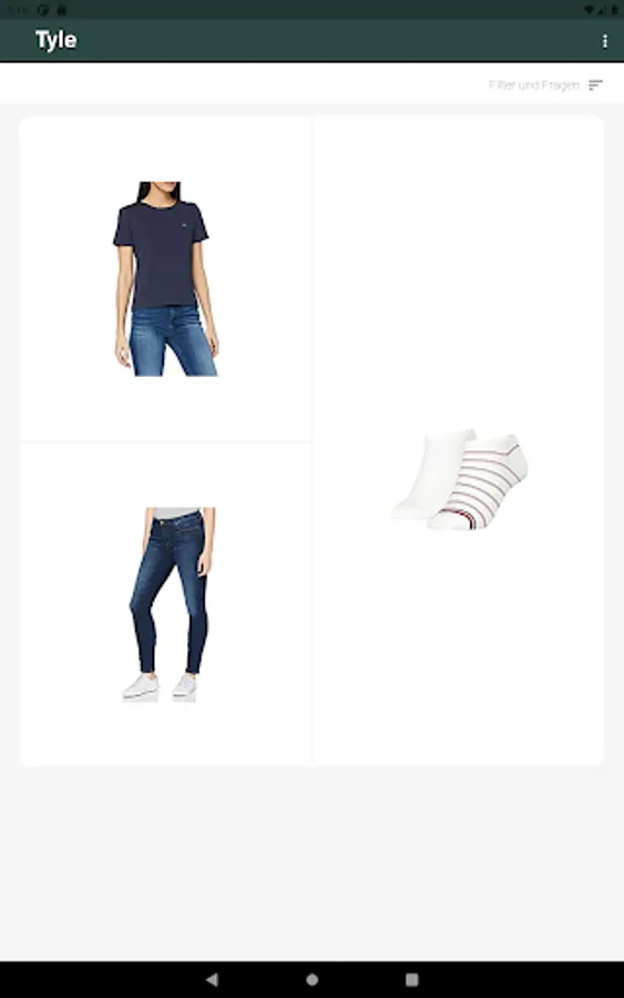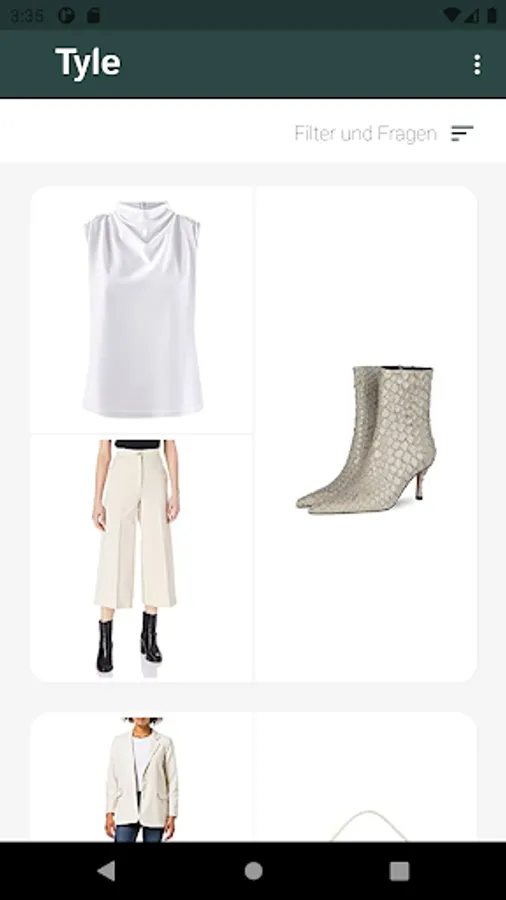 Tyle is designed to help you find outfits that are perfect for you, while also giving you the opportunity to incorporate sustainable products into your wardrobe. By answering a few questions about yourself and your personal preferences, Tyle goes through a logic pool created by our fashion stylists and offers you outfits that meet your criteria and suit you perfectly.