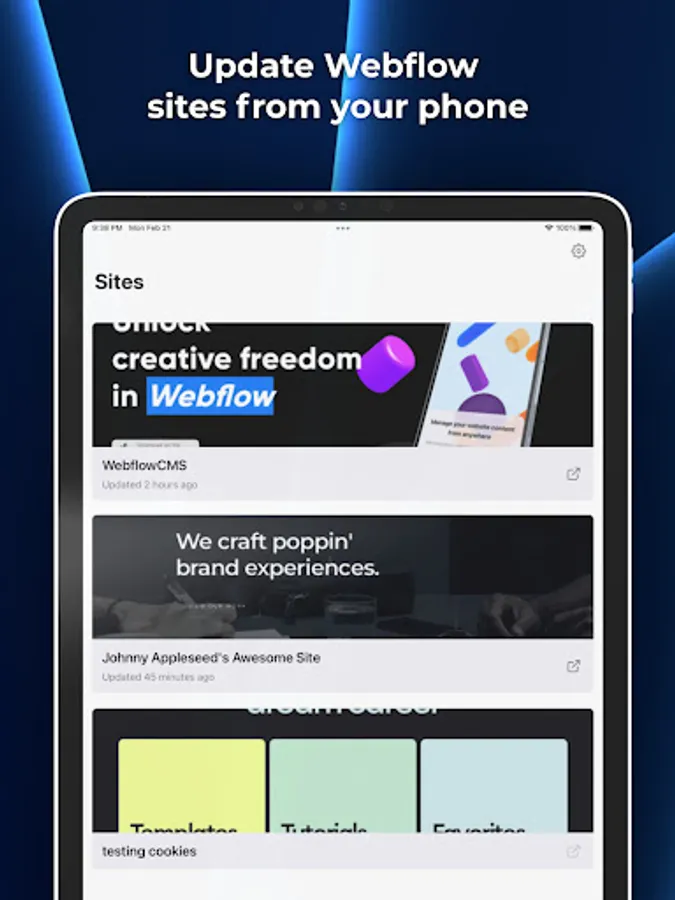 WebflowCMS is a powerful tool to take your creativity on the go. Edit site content, post blogs, or upload photos to your website from you phone.