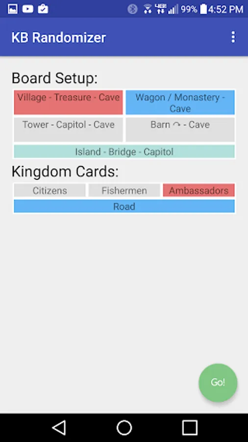 This app serves as a randomizing tool for setting up Queen Games' Kingdom Builder. The app fully supports all combinations of the four produced expansions and three produced promotional items for the game, and it fully randomizes everything you could possibly need randomized, from the boards, to the kingdom cards, to the nomad spaces and capitol locations! The app even provides some basic options for how to integrate the promotional items with the randomization process of the main games. View the About page included with the app for more specific information on what exactly these settings can do.