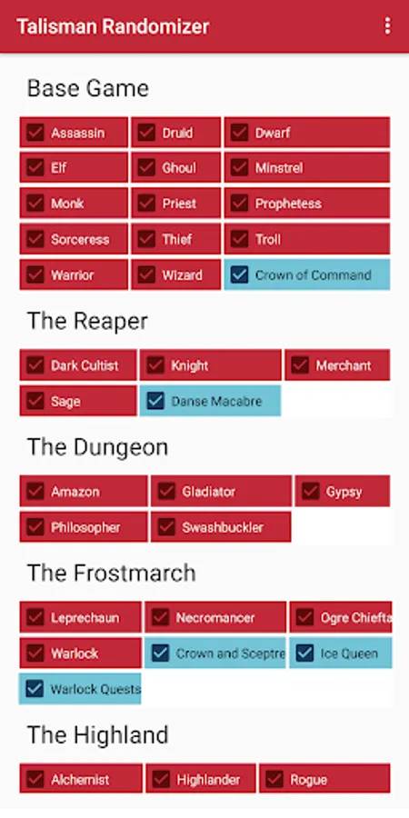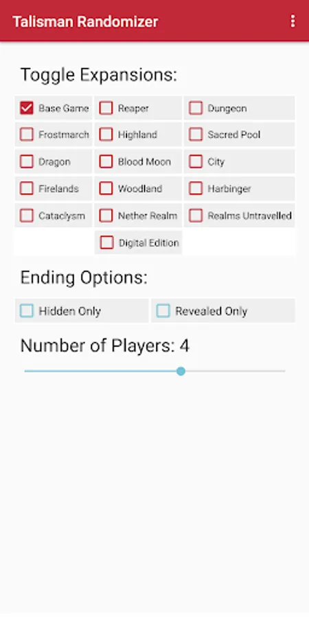 This is a fan-made app that randomizes the characters and alternate endings used in a game of Talisman: Revised 4th Edition.