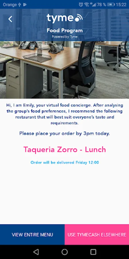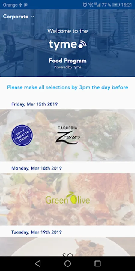 Join Tyme's corporate program and have our robust platform manage your company's food program. Our A.I. platform quickly learns your team's likes and preferences, and automagically picks the appropriate restaurant you can all enjoy in addition to the meal that each person will enjoy. Contact us and find out why hundreds of companies lean on Tyme to manage their company food and snack programs.