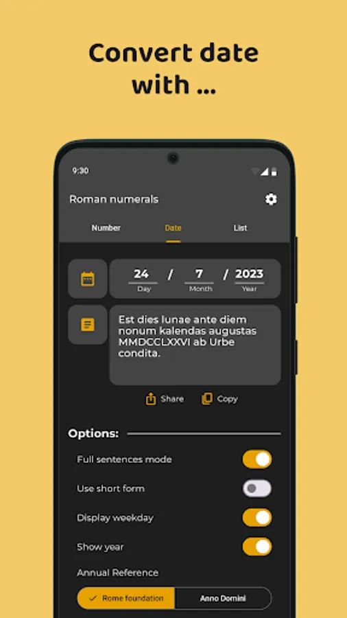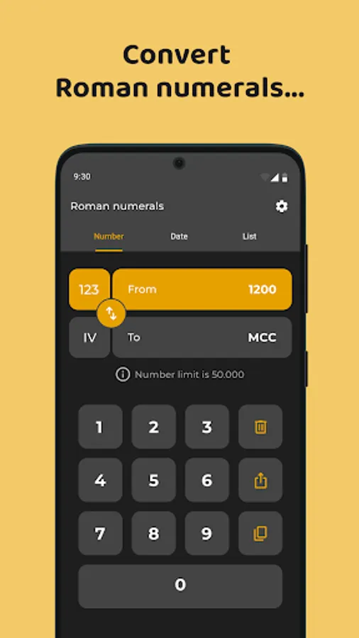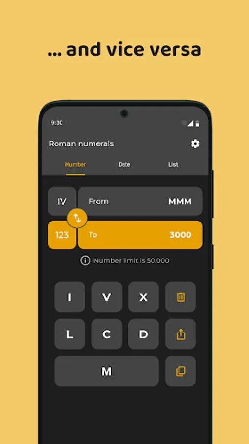 With this tool you can easily convert any numbers (decimal numbers) into Roman numerals. You can also convert Roman numerals to decimals and divide or copy them directly from the app.