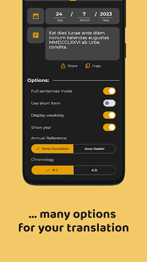You can also convert any date into Roman or Latin notation. You can choose between different options. Shorthand, year reference, weekday display, and many more.