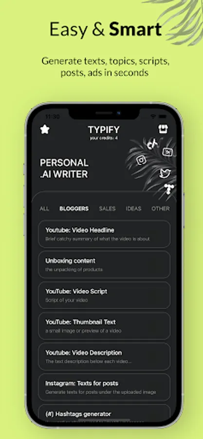 Typify is a revolutionary mobile application that is designed to provide bloggers, copywriters, product owners and other users with a way to quickly and easily generate automated text content. Our free app uses the latest GPT-3 model of Artificial Intelligence to help users write copy with greater speed and accuracy. Complete with a selection of predefined samples of prompt text and a simple user interface, Typify’s AI-powered copywriter is sure to take your writing to the next level.