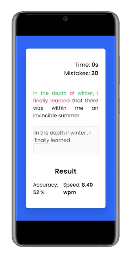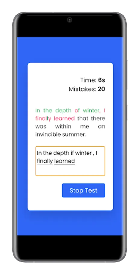 Typing Speed Test app is useful to test/measure the typing speed of a user. Learn typing and find how fast you can type. The app has a rich set of free typing lessons with options like hard/medium/easy typing to do online typing practice and learn to type. Letters are highlighted to help you focus on typing. You can become a typing master with the help of this app or can play typing games for fun.