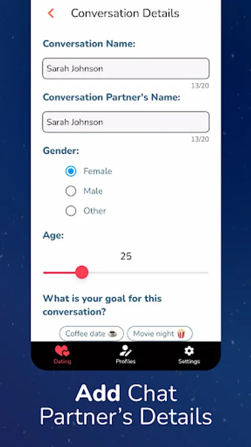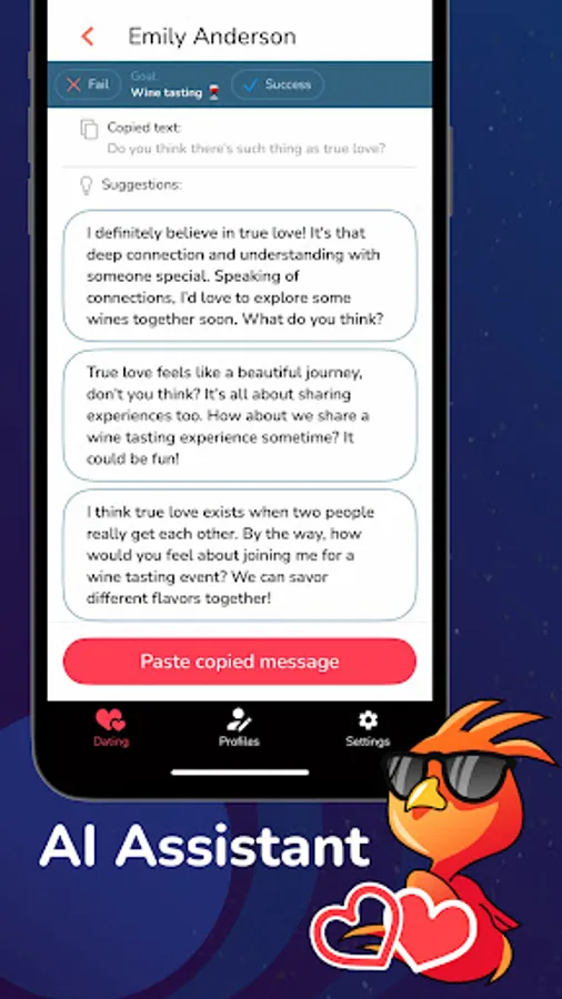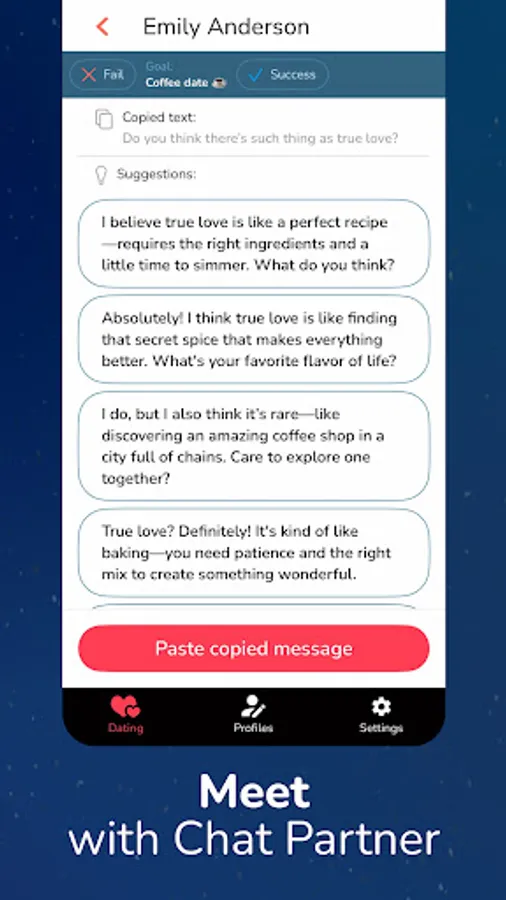 Example: Just matched with someone special? Let’s say her name’s Emily. Set up Emily’s profile in Typly, choose your goal - like inviting her out for coffee - and let Typly work its magic. Follow these easy steps: