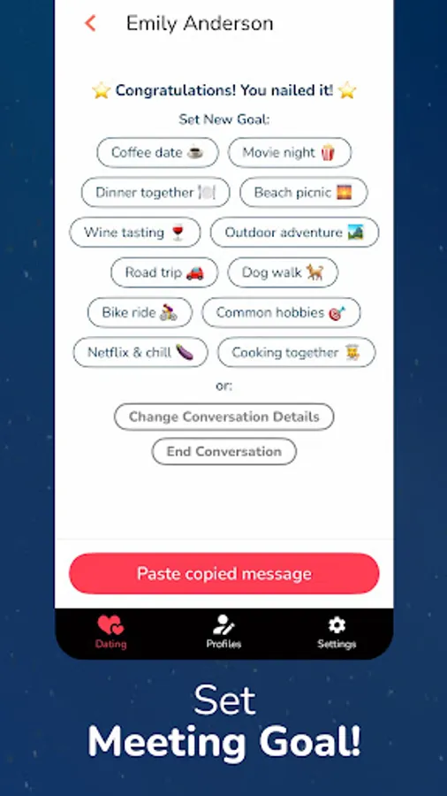 - Once successful, simply tap the ‘Success’ button and set a new goal to keep impressing your match!
