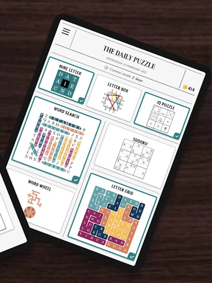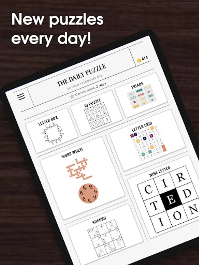 Everything from the classic puzzles like Sudoku or Word Search, to new puzzles like Nine Letter, Triads or maybe you wish to practice your logical thinking with a daily IQ Puzzle?