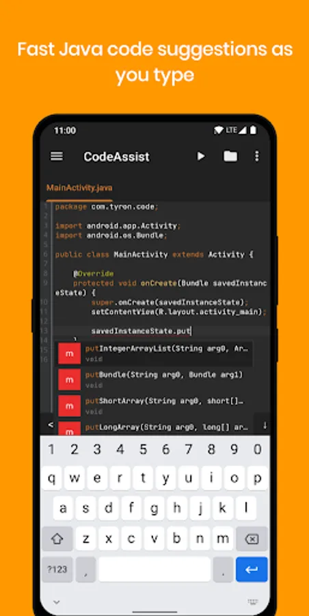 - Auto Code Completions: Just focus on coding, not writing. The intelligent code completion efficiently suggests what to write next without lagging your device! (Currently for Java only)