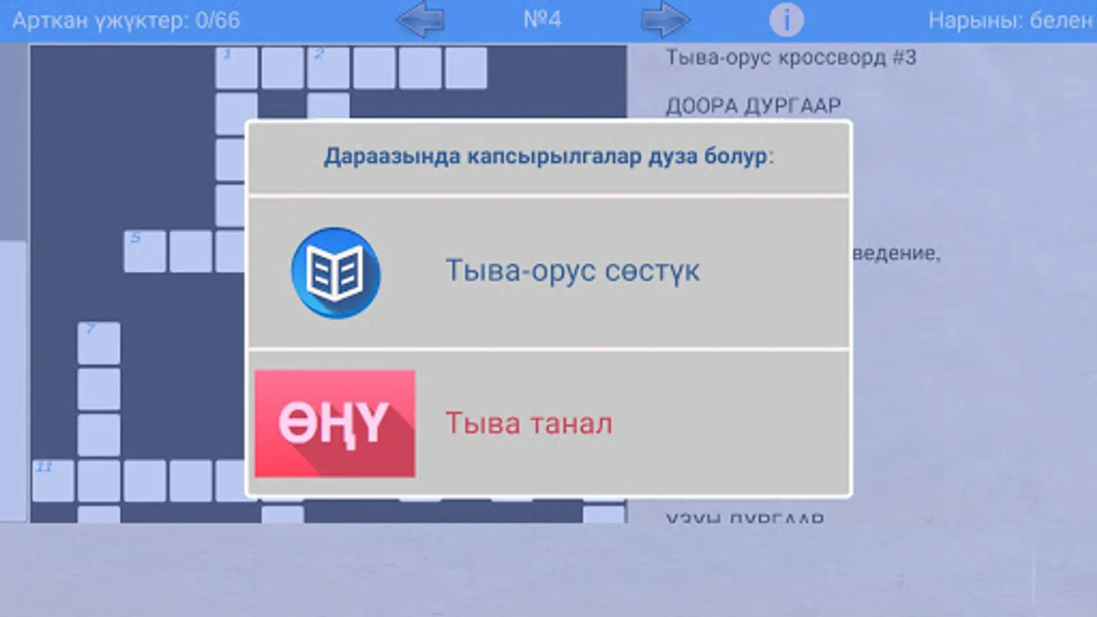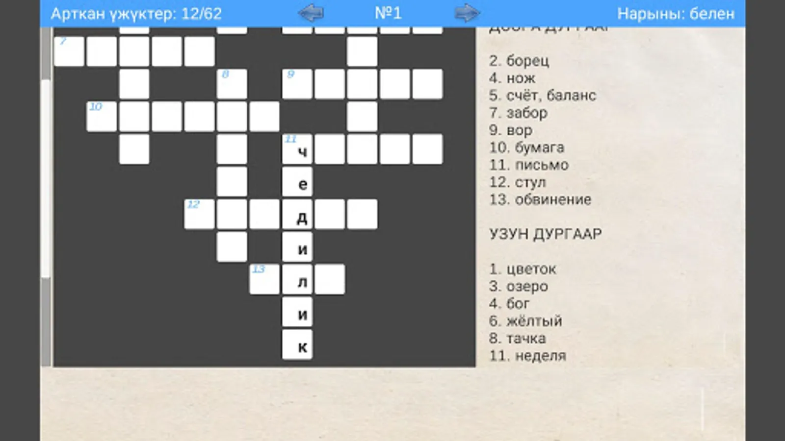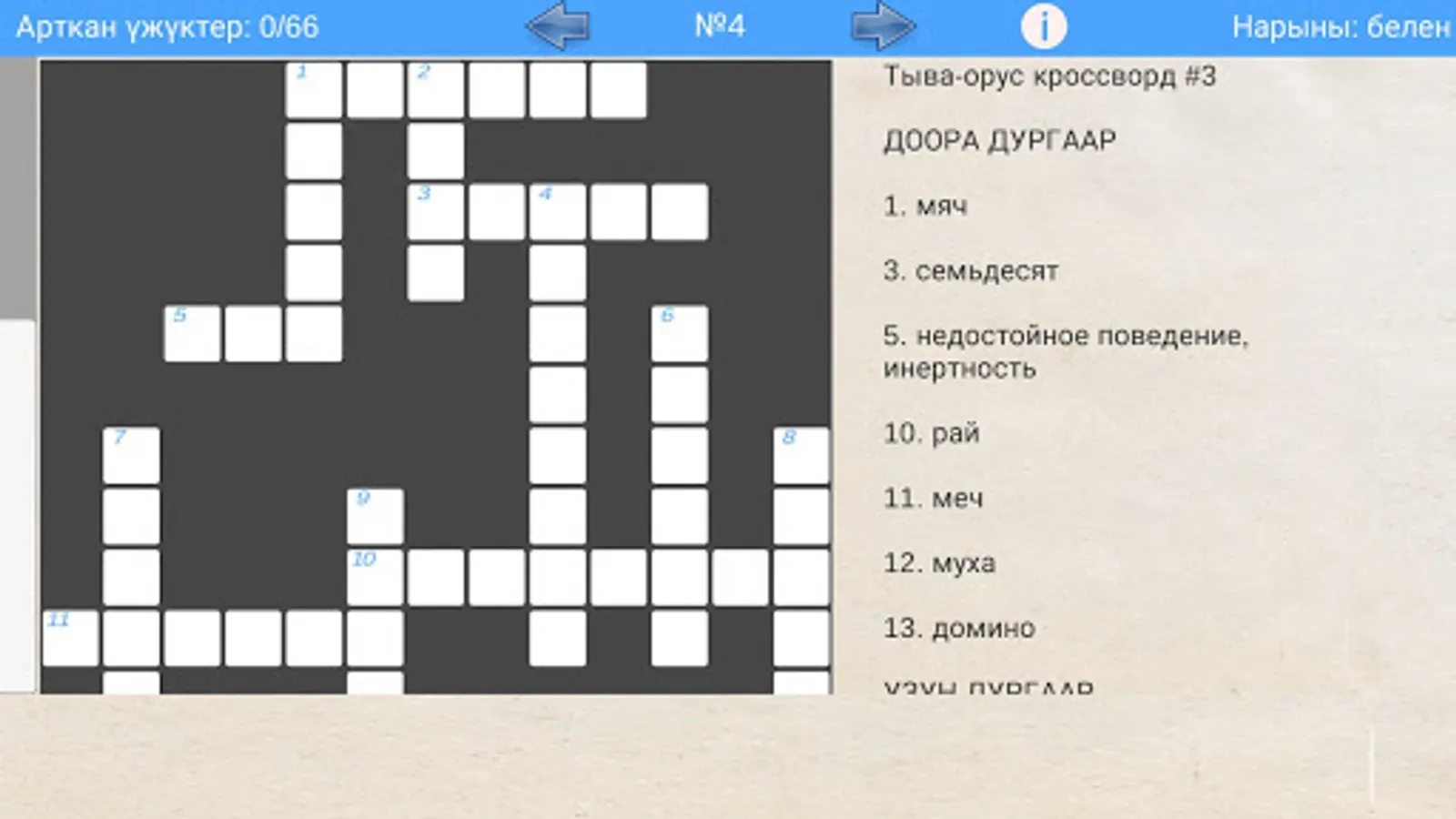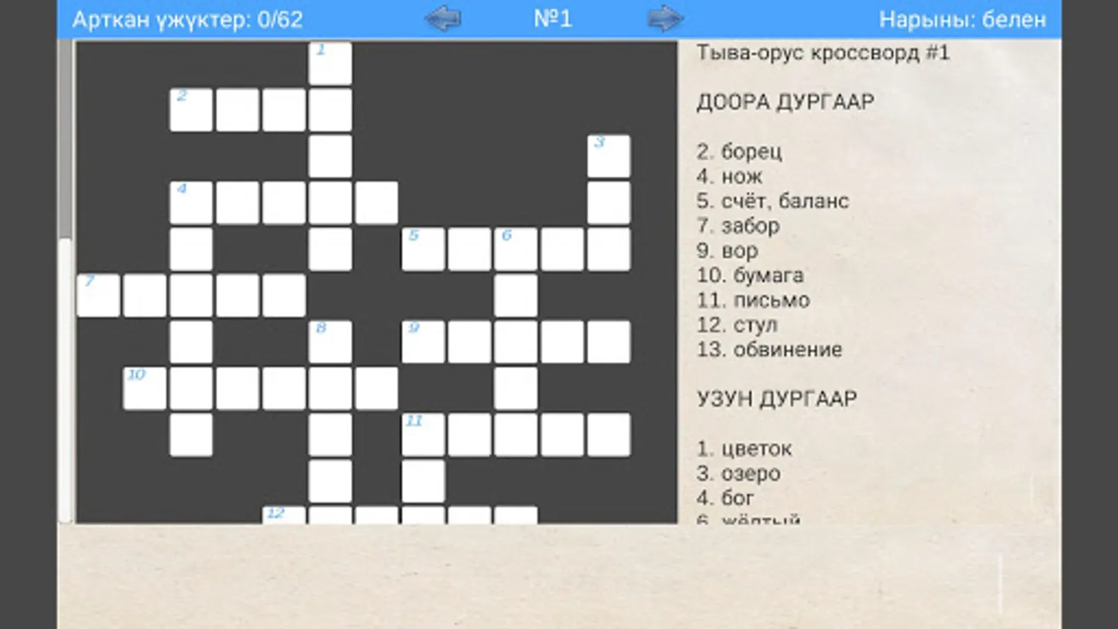 Tyvan words - the application of a crossword puzzle with Tyvan words. There are simple and complex crosswords. Now there are 2 types of crosswords: crossword translation from Russian into Tyvan and crosswords of Tyvan riddles.