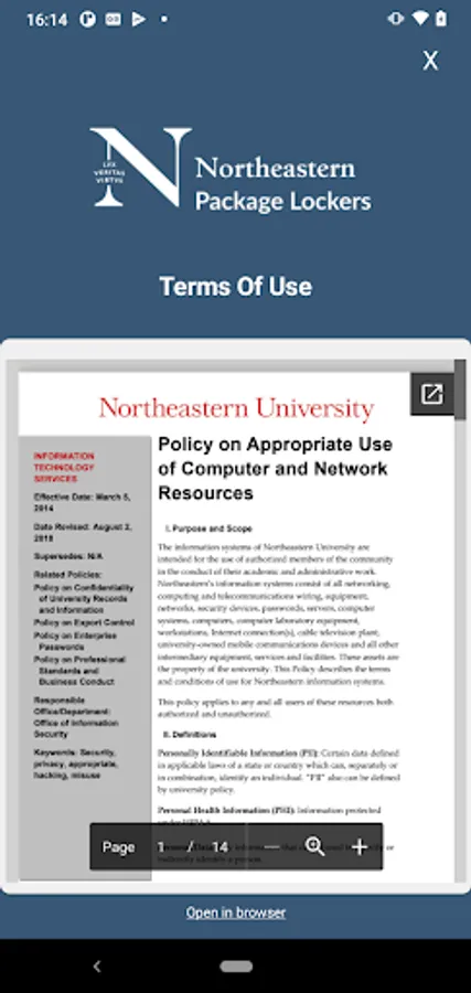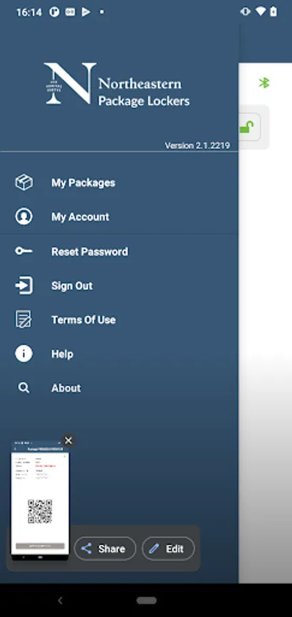 The NU Husky Package Lockers Mobile App provides the following functionality: