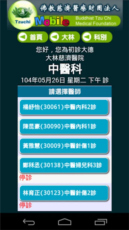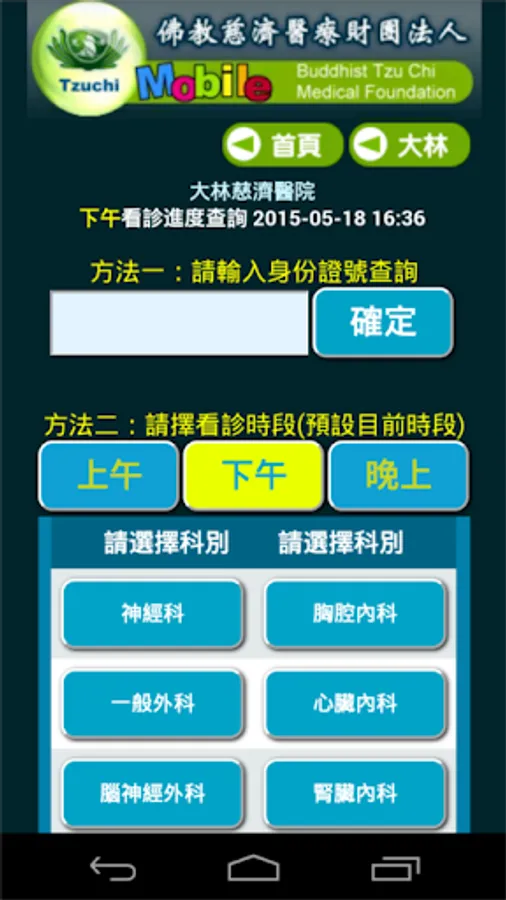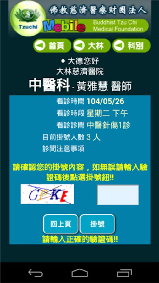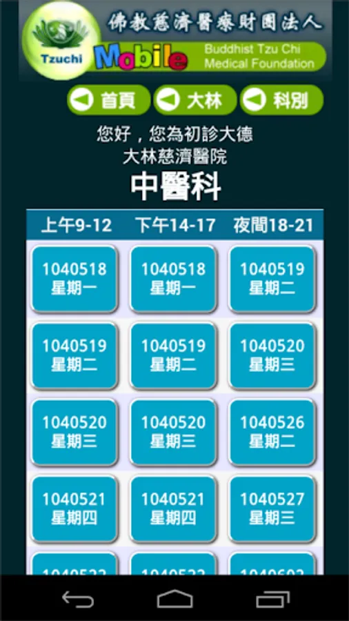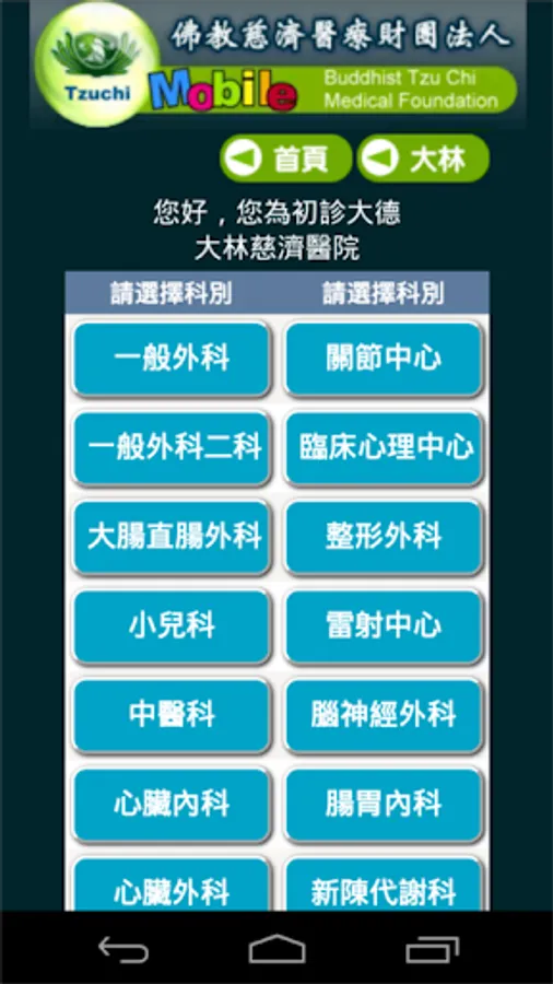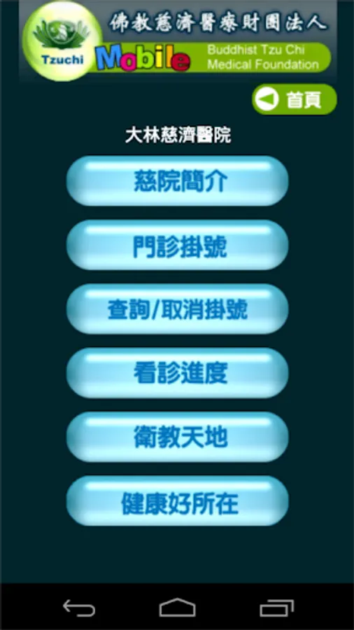 隨行動資訊科技發展,為服務廣大民眾就醫便利性 ,發展慈濟醫療志業行動掛號系統,提供佛教慈濟醫療財團法人七家院所(花蓮慈濟醫院、玉里慈濟醫院、關山慈濟醫院、大林慈濟醫院、臺北慈濟醫院、臺中慈濟醫院、斗六慈濟診所 ) 行動掛號服務,功能包含醫院簡介、門診掛號、查詢/取消掛號、看診進度及衛教天地等便利之醫療資訊服務,可隨時隨地掌握您自己及家人的健康。