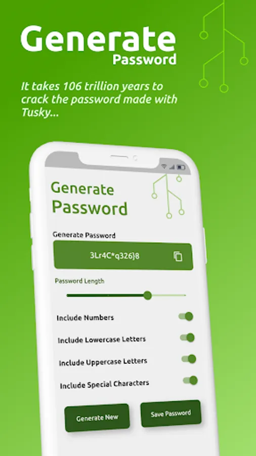 No more frustration over the websites or the app which keep reminding you that your password is weak. Go to generate password in Tusky and create the strongest password that no hacker can break. Tusky generates password by using ascii keywords, English alphabets (lower and upper case both), and numbers. You can save the generated password with just a single click. With Tusky generating passwords has become easier than ever before.
