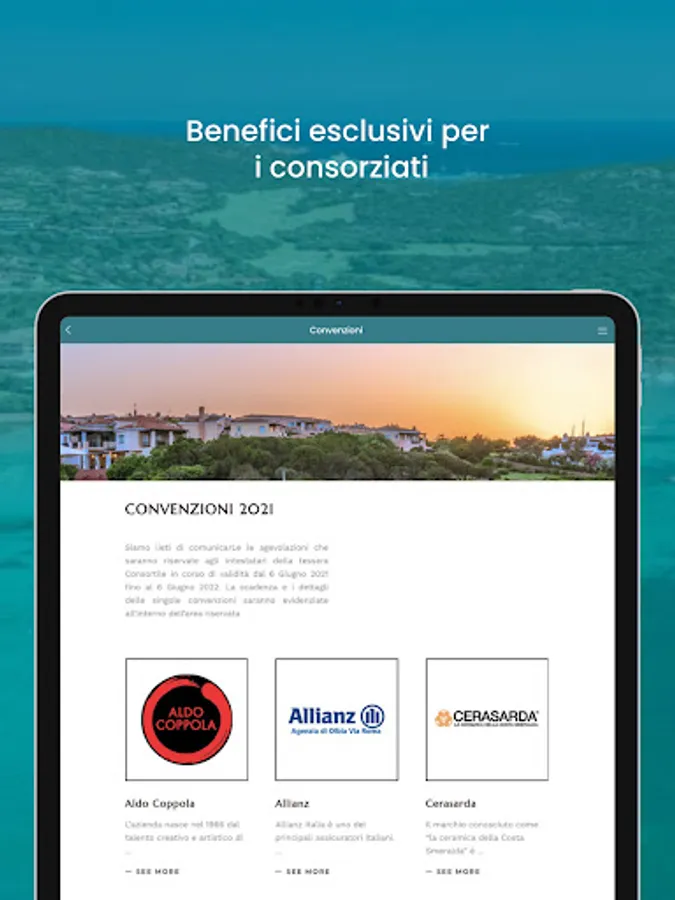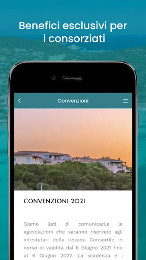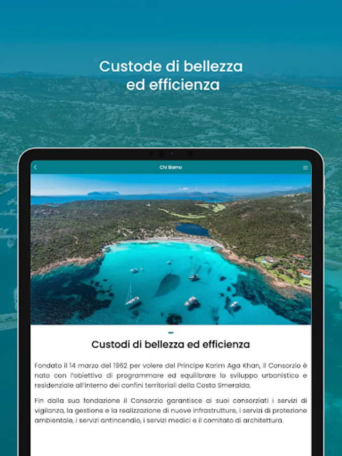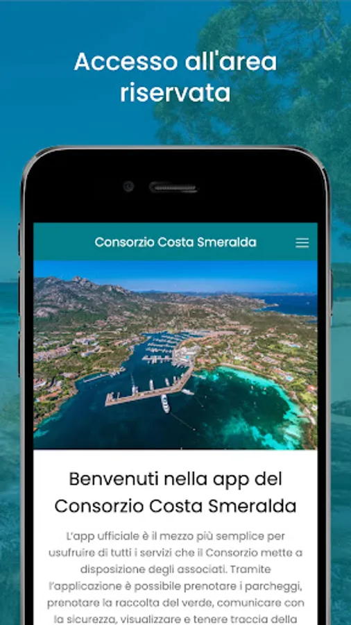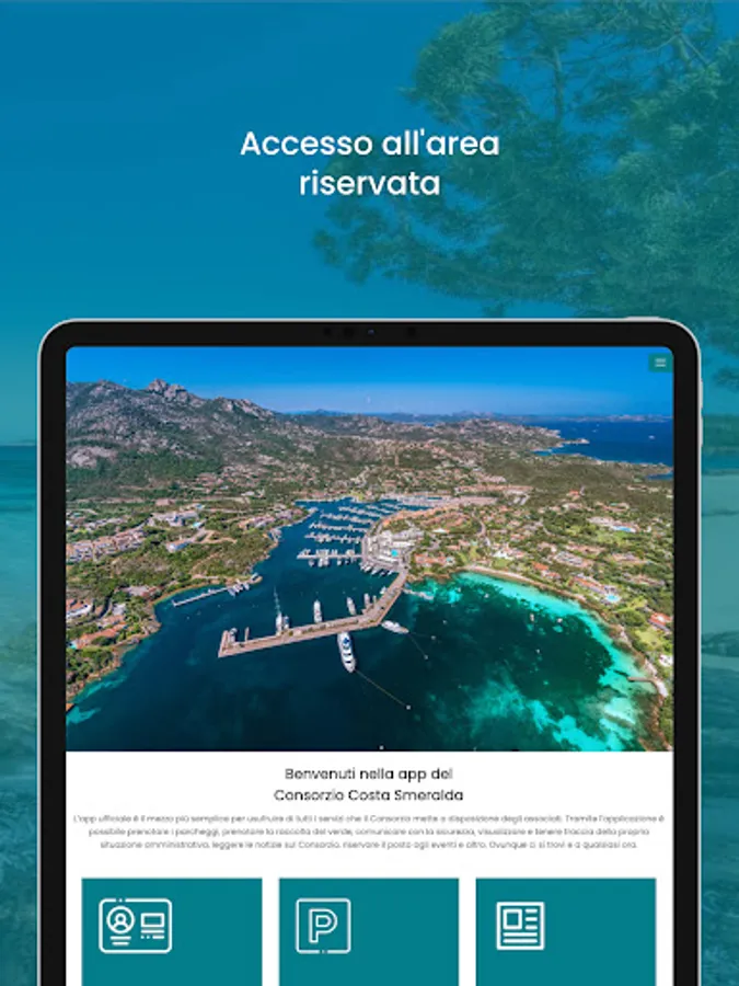The app is for the Consortium members, which are owners of buildings and businesses within the Costa Smeralda. The objective is to make the services created by the Costa Smeralda Consortium available to members via this app. The services include garden collection booking service, parking reservation, security intervention request, annual association payment and various services.
