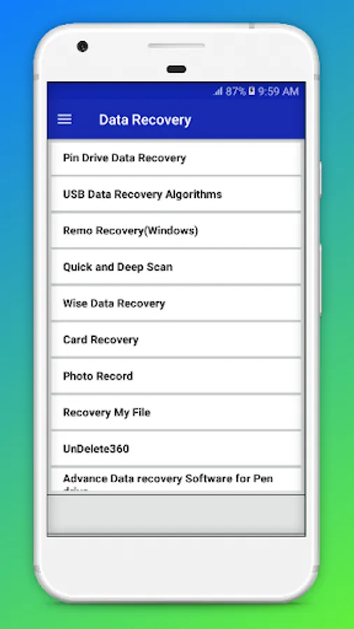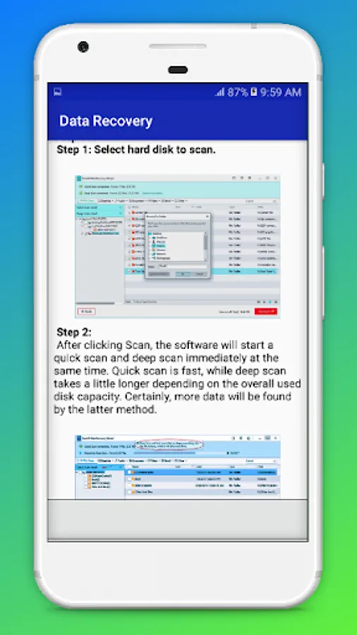 Mobile phone data recovery guide 2022 app enables you to recover deleted data from USB, Memory Card, Mobile, Hard Disk and Computer with the help of Data Recovery Guide. Recover deleted Audios ,Recover / Retrieve deleted song, Recover Documents from gallery and from any other storage, Recover All Type of files (Support different extensions) with the help of data recovery guide.