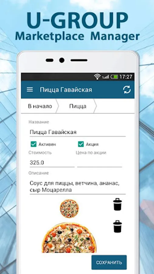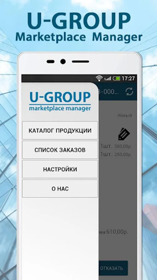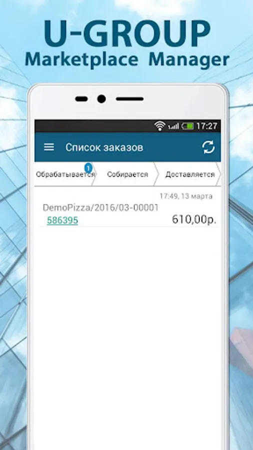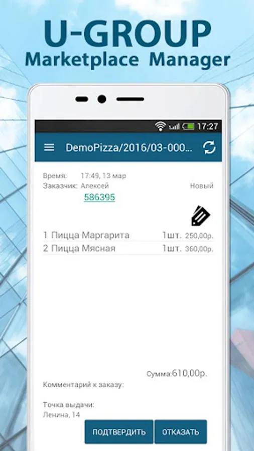 To view the features of the application in demo mode when you start the application, enter the username demopizza, leave the password blank. Additionally, set Demopizza https://play.google.com/store/apps/details?id=com.u_grp.android.marketplace.demopizza application. All orders DemoPizza made in the application will be received in the Marketplace Manager application.