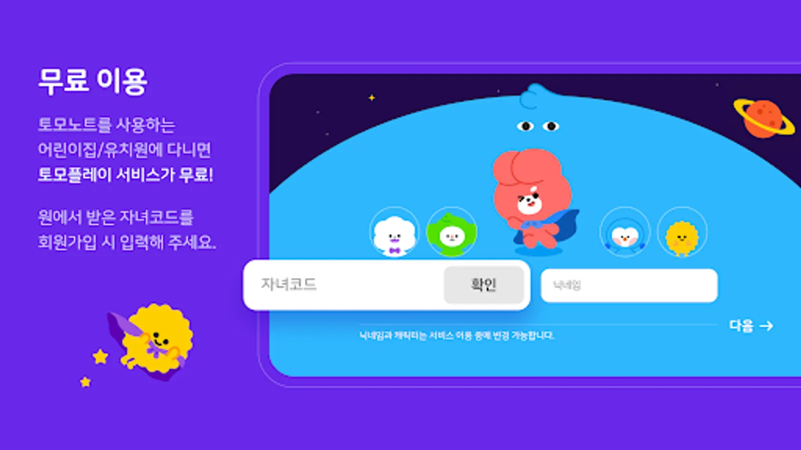 - When signing up, child code authentication is required, and general users are restricted from joining.