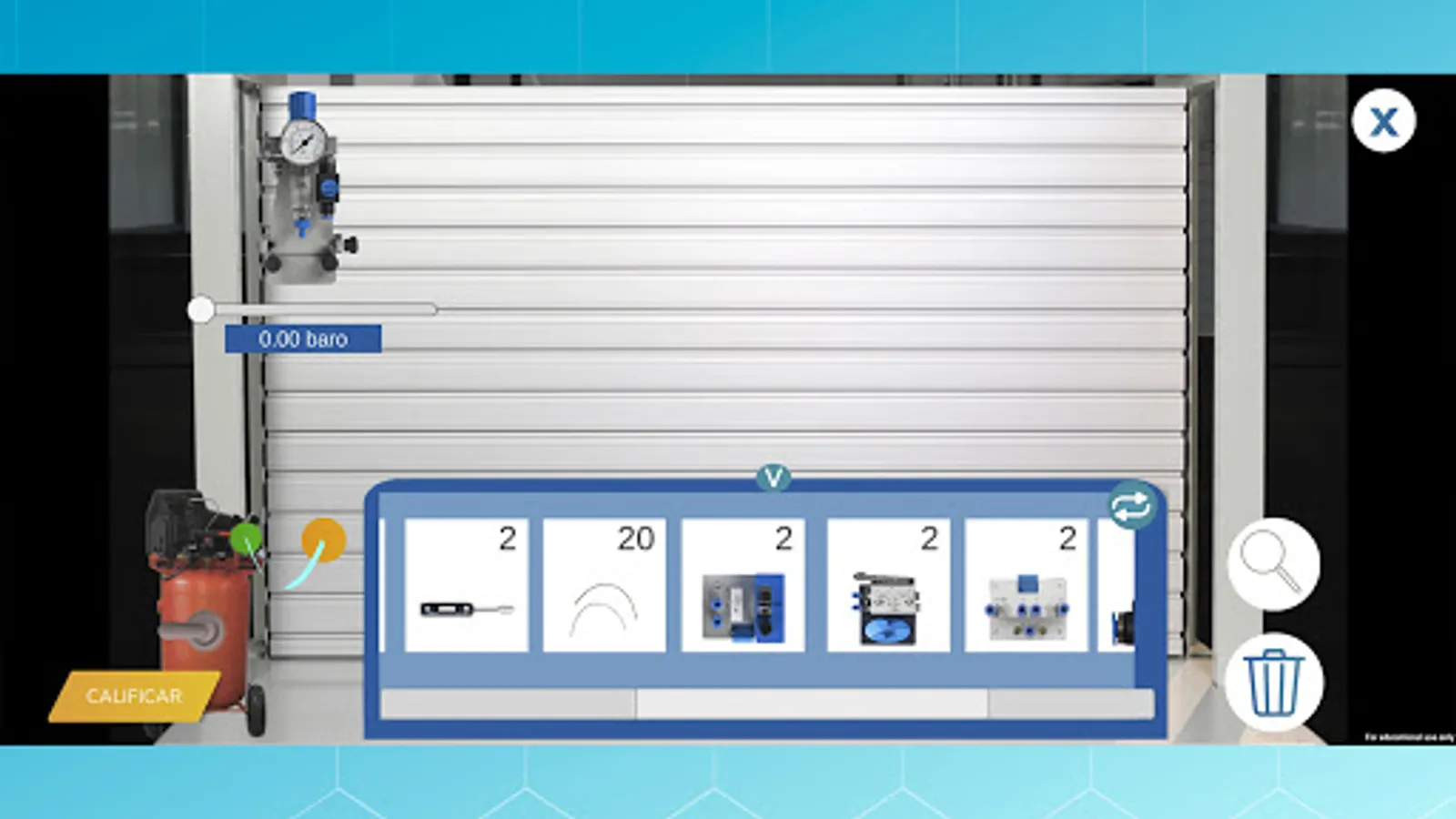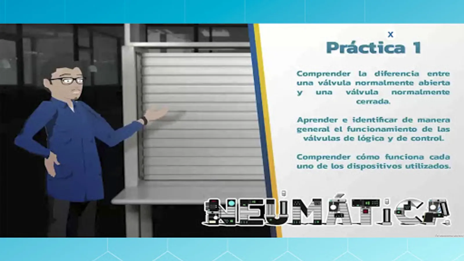 This application has a pneumatics laboratory simulator, which will allow you to know the safety rules of a laboratory, three basic pneumatics practices, as well as augmented reality to identify the elements of the practices by name and symbology.
