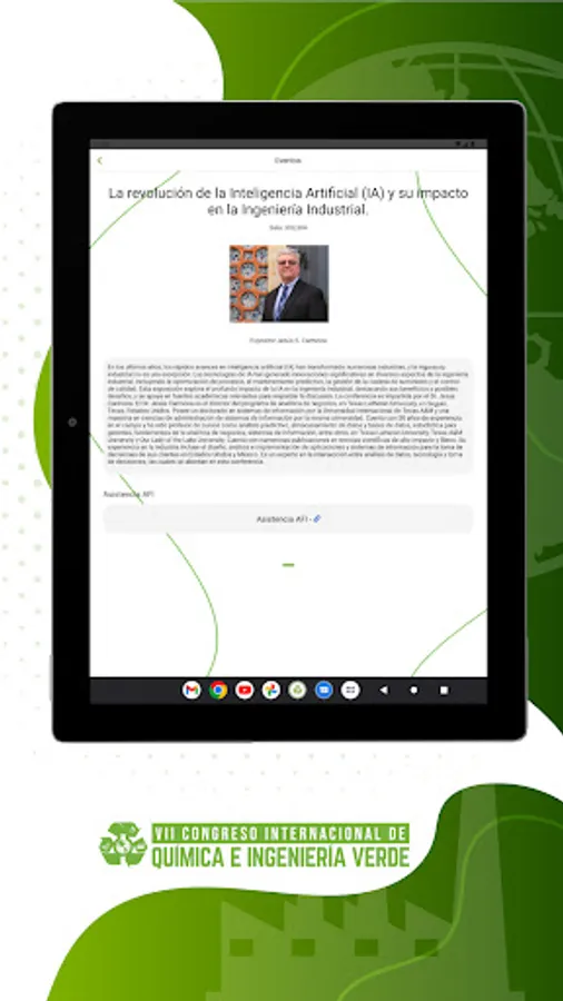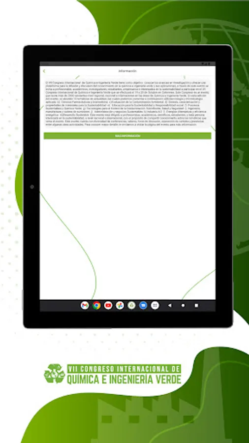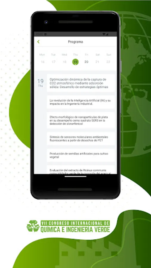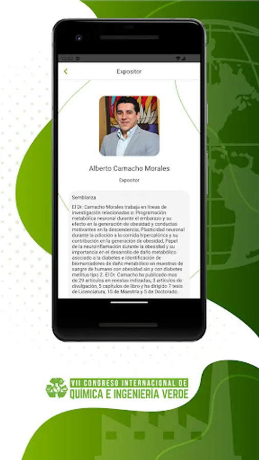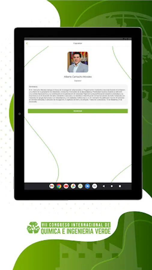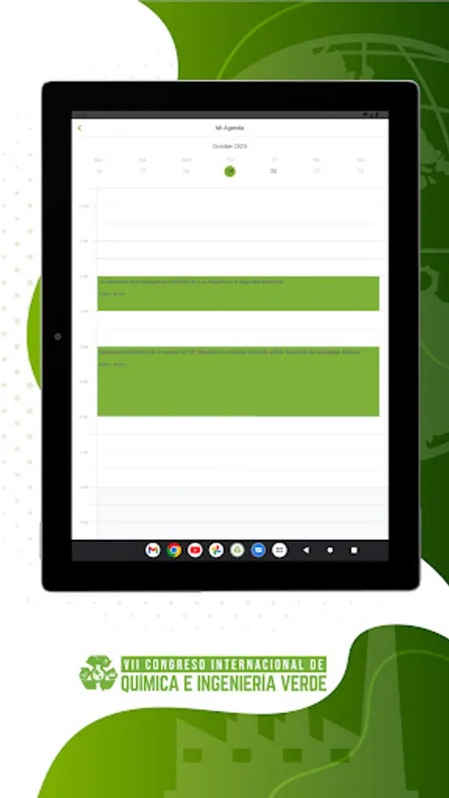 The official App of the VII International Congress of Green Chemistry and Engineering will allow those registered for the event to review the agenda with the list of keynote conferences, paper presentations, poster exhibitions and workshops. Users can select the activities they are interested in to receive notifications and reminders. It also has the lecturers section where the curricular summary of each of them will be found. Through this App you will have access to live broadcasts of the activities to be carried out virtually.