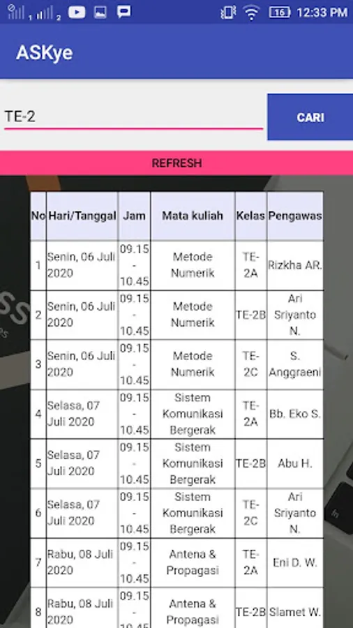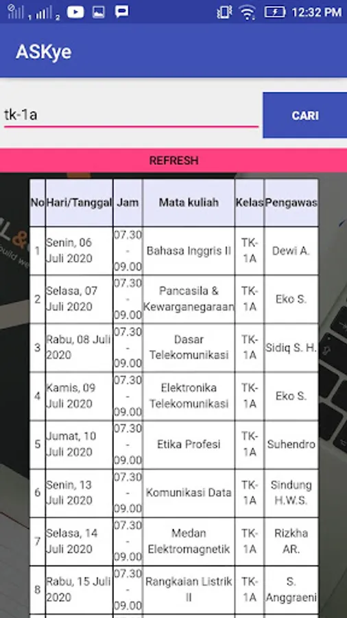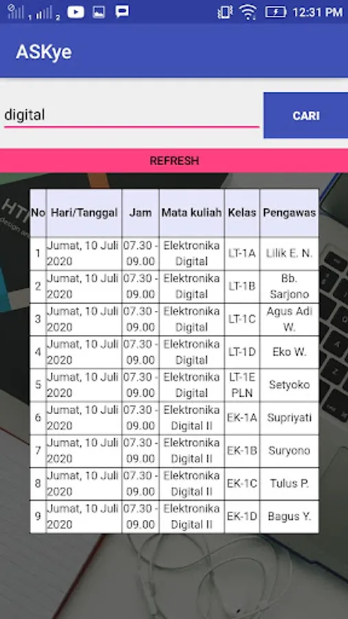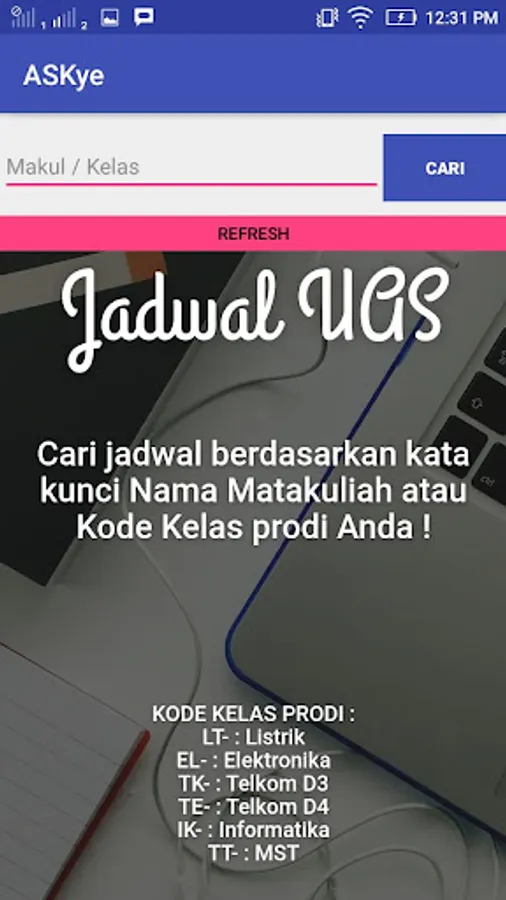 ASKye is an application to help students find the schedule for the Final Semester Examination in the Electrical Engineering Polines Environment. ASKye needs keywords in the form of course names or Study Class Codes to help filter data according to the criteria given.