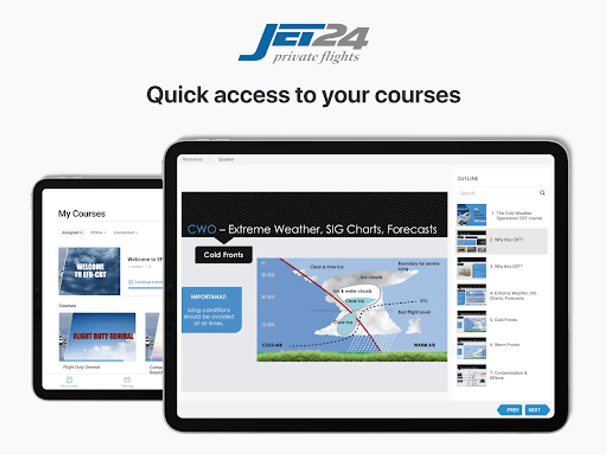 Jet24 is an easy-to-use hosted Learning Management System (LMS) for Flight Crew. The training platform is a combined product of technology and aviation experts all aimed to provide one high-end quality training infrastructure to assist companies with their training demands.