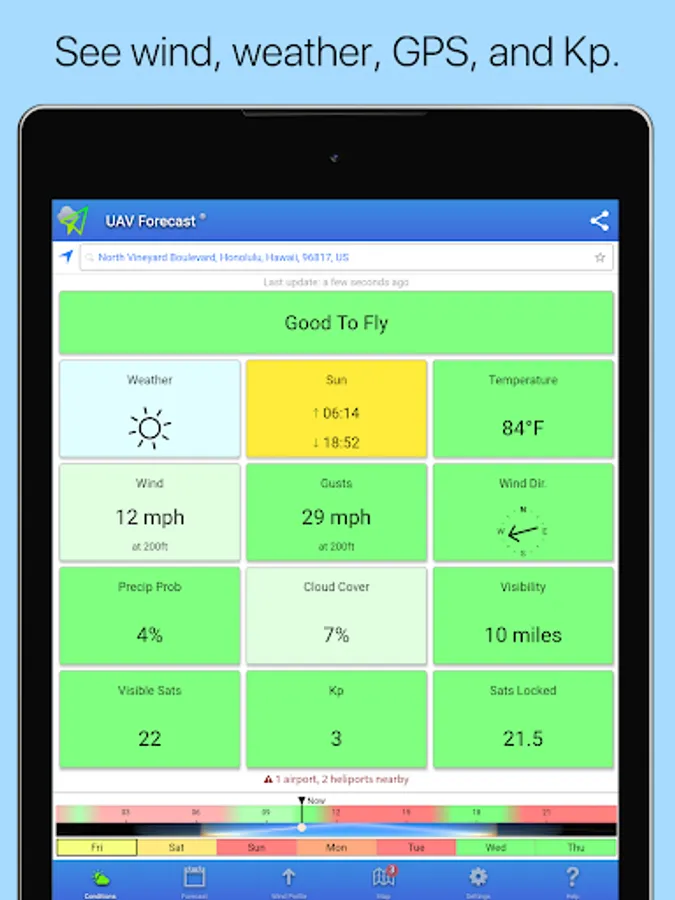 When will it be good to fly your quadcopter? See the weather forecast, GPS satellites, solar activity (Kp), No-Fly Zones and flight restrictions, all in one convenient tool. Perfect for DJI Spark, Mavic, Phantom, Inspire, 3DR Solo, Parrot Bebop drones and many other Unmanned Aerial Vehicles and Systems.