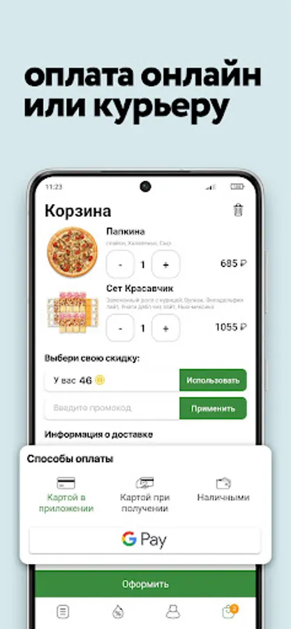 • payment in a convenient way: Google Pay, card, cash