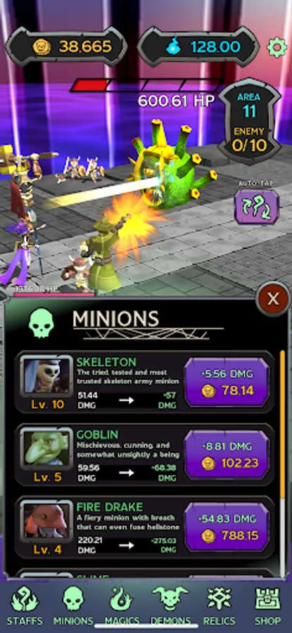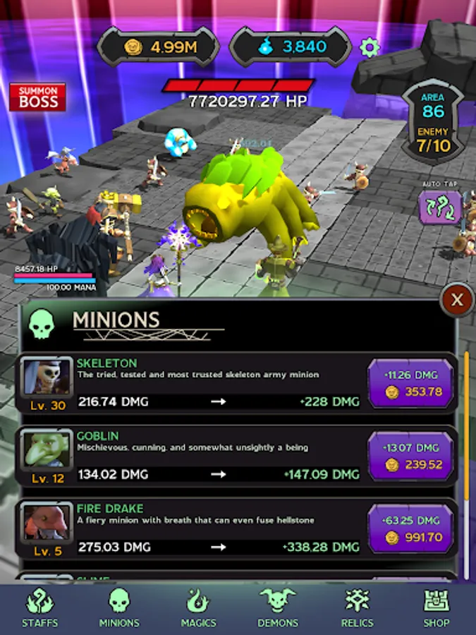 Upgrade staffs to gain higher base attacks. Raise minions such as the Skeleton, Goblin and Drake from the far depths.