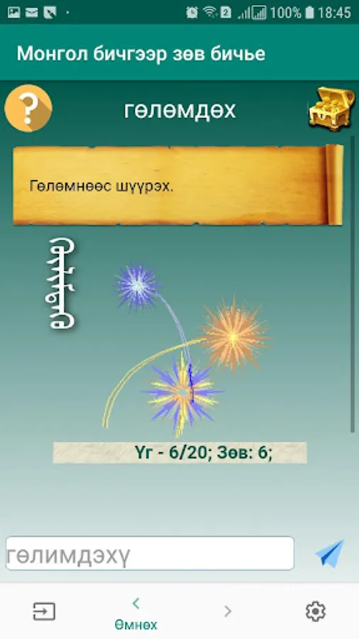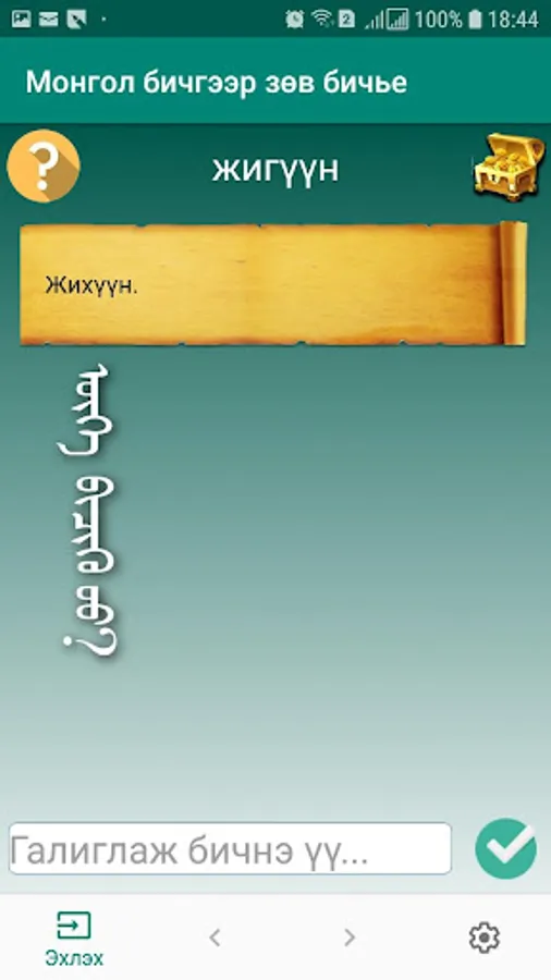 This software is a game type application designed to help you learn how to type in the right Mongolian spelling.
