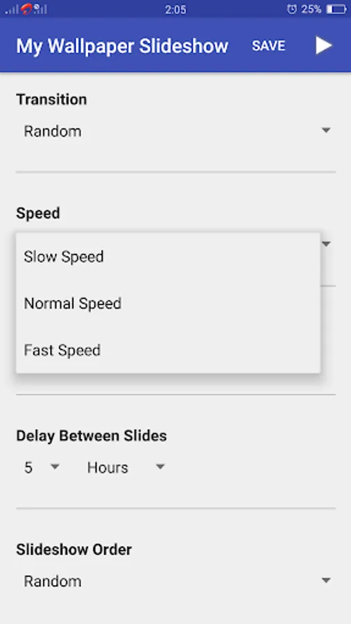 Either navigate from the application or go to Android Live wallpaper list and choose "My Wallpaper Slideshow" application to set the Live Wallpaper Slideshow.