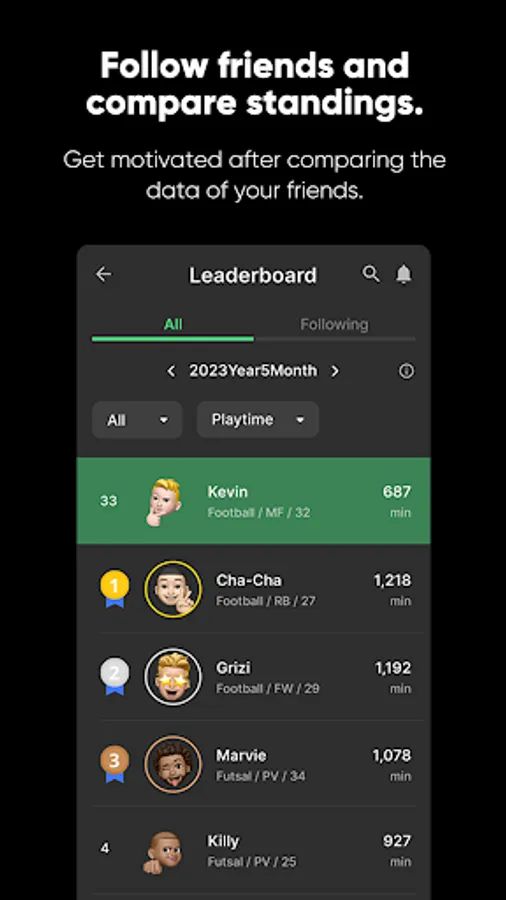 - View global leaderboard for each category and compete for standings based on followings and followers!