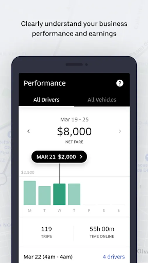 - Track your drivers’ performance - number of trips, hours online, and trip earnings.