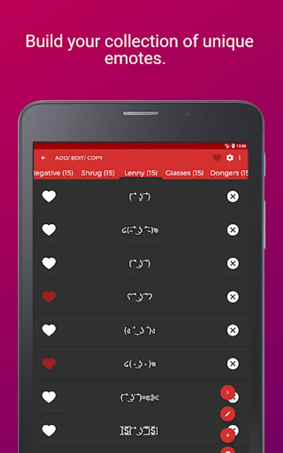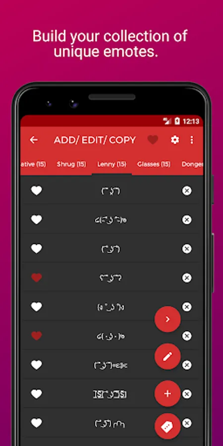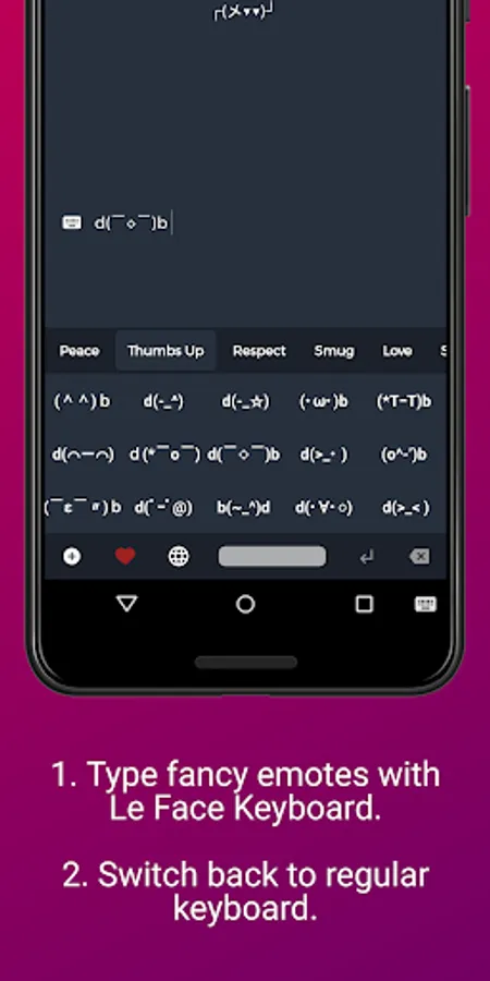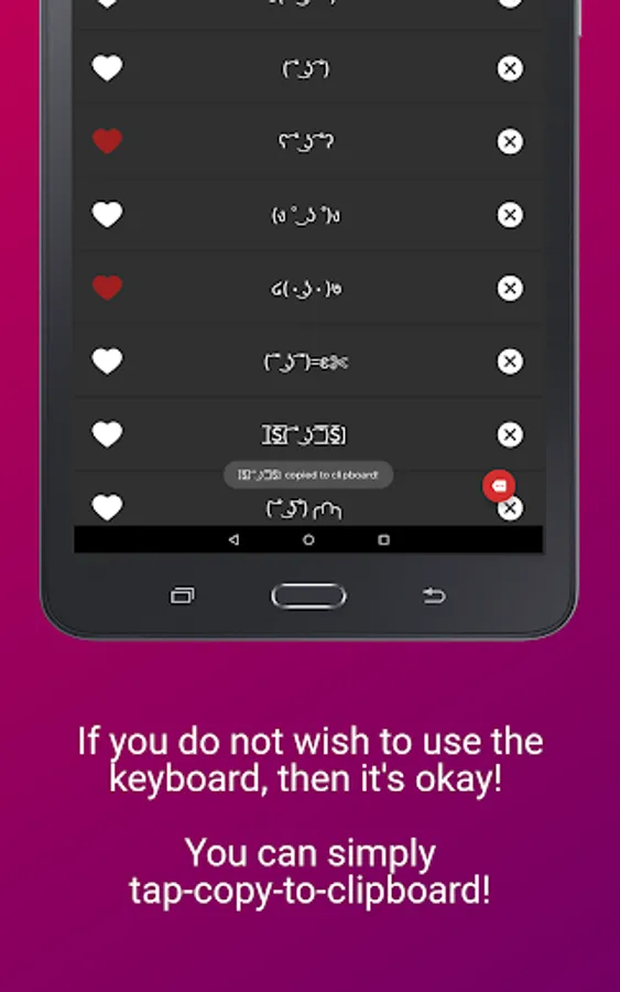 ⁍ Easy Clipboard: If you don't want to use the keyboard and keep it simple, then you can use the app to copy-paste emotes/ unicode memes instead. You can visit the listing screen in the app, tap on a key and copy to clipboard. You get a huge range of collection to play with.